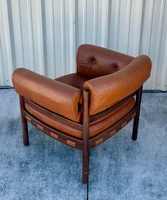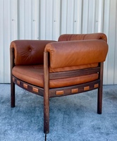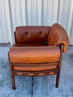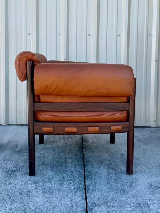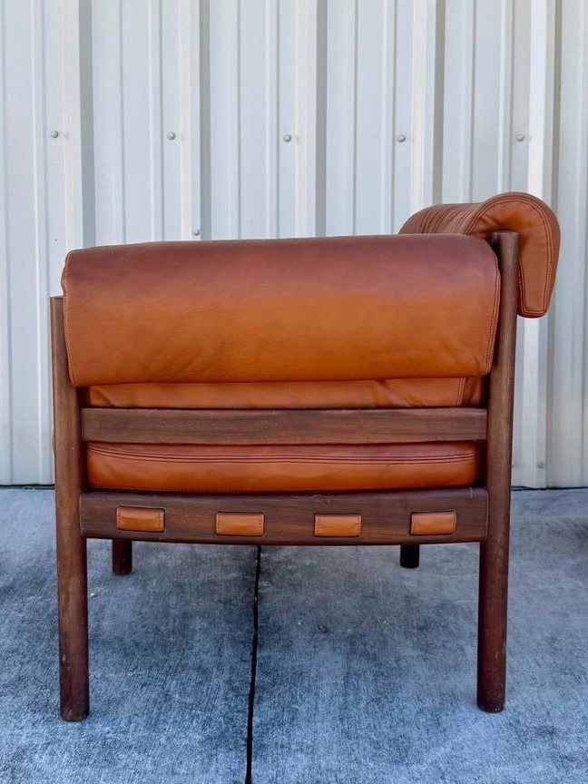 Beautiful vintage Arne Norell leather armchair in rich cognac leather with button tufting, rolled arms, and a solid wood frame with leather strap details. Extremely comfortable with a gorgeous aged patina that only true vintage Scandinavian leather develops. The frame is sturdy, the leather is soft, and it’s a perfect accent chair for living rooms, studios, offices, or a mid-century modern setup. This chair is part of a larger matching set (3-seater sofa + 2-seater loveseat available). Open to package pricing if you’re interested in more than one piece. • Height: 72 cm (28.3 in) • Width: 75 cm (29.5 in) • Depth: 71 cm (28 in) • Seat Height: 41 cm (16.1 in) Pickup in Lafayette, LA Can deliver to city outside of Lafayette for a fee.