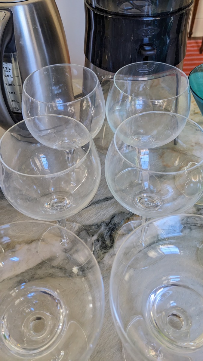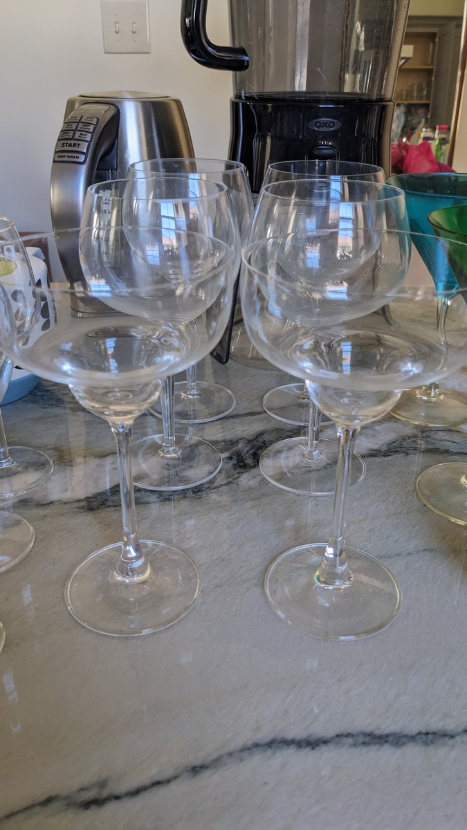 assorted glasses. great shape, none of them used more than twice. just been sitting in cupboard for an eternity waiting for love. stop drinking wine out of dixie cups and come save them.