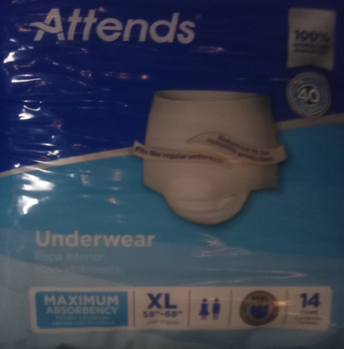Attends protective underwear with maximum absorbency, designed to fit comfortably like regular underwear. Suitable for waist sizes 58"-68", providing 14 count for long-lasting protection. Ideal for both men and women seeking reliable incontinence support. The pack is new and unopened, ensuring complete satisfaction.
