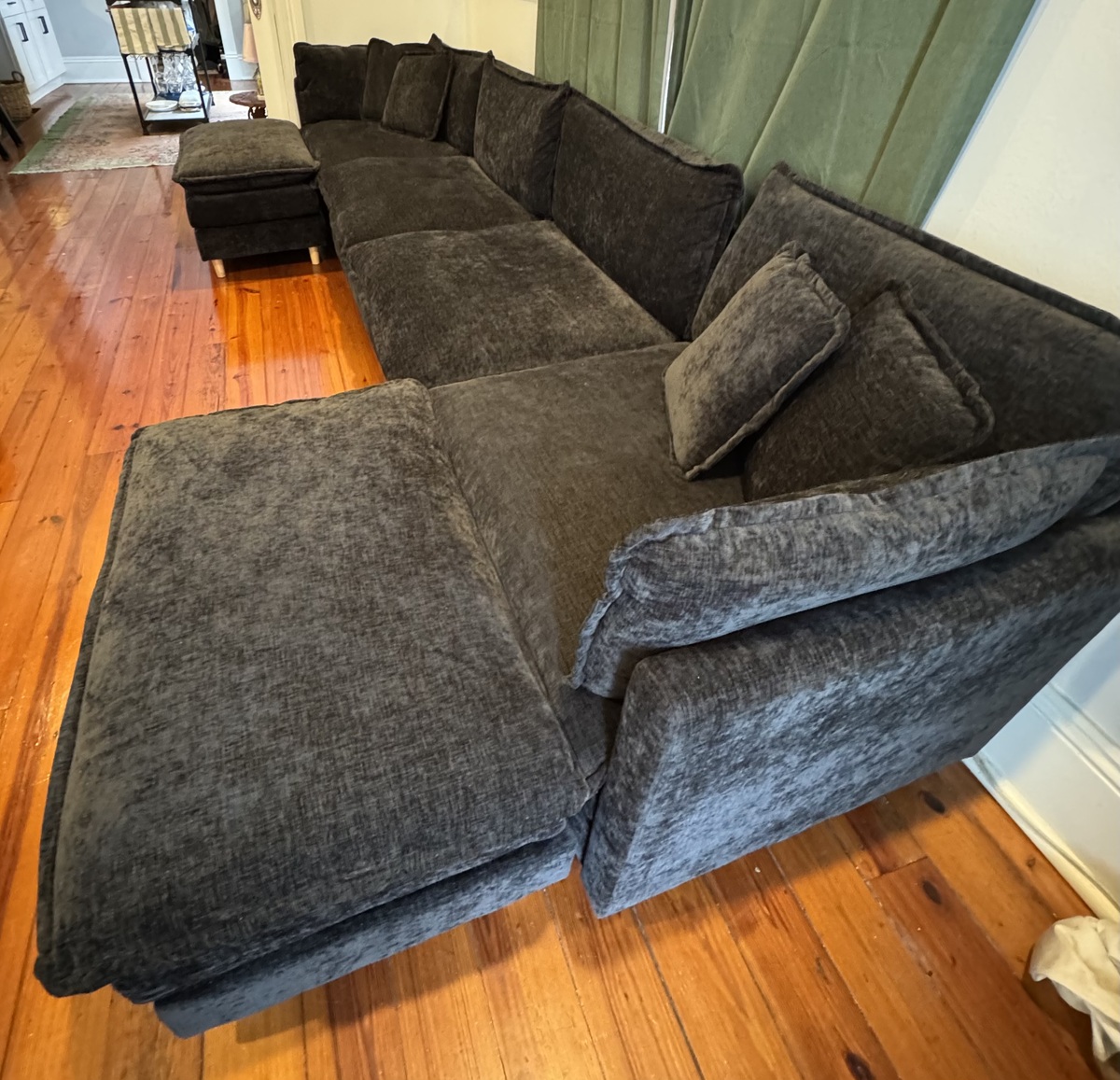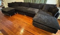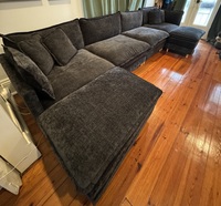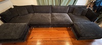OBOOnly 3 months old - we've decided that it is too large for our space. No pets, no kids, very comfy! 143" x 35" for main couch, each sectional measures 24'' x 35'' Comes with 4'' wood feet and the original 2'' black plastic feet if you prefer a lower profile. Online retail listing for more information: https://www.macys.com/shop/product/streamdale-furniture-black-chenille-modular-sectional-sofa-with-ottomans?ID=25457944&tdp=cm_app~zMCOM-NAVAPP~xcm_zone~zPDP_ZONE_G~xcm_choiceId~zcidMKVSGX-63c270e8-4e1d-4b3e-baf1-6e64a22d0f0b%40HE8%40You%2Bmay%2Balso%2Blike%2429391%2425892375~xcm_pos~zPos4~xcm_srcCatID~z29391