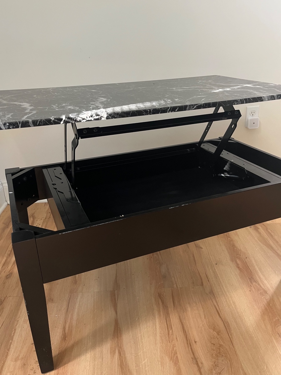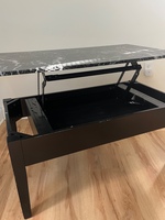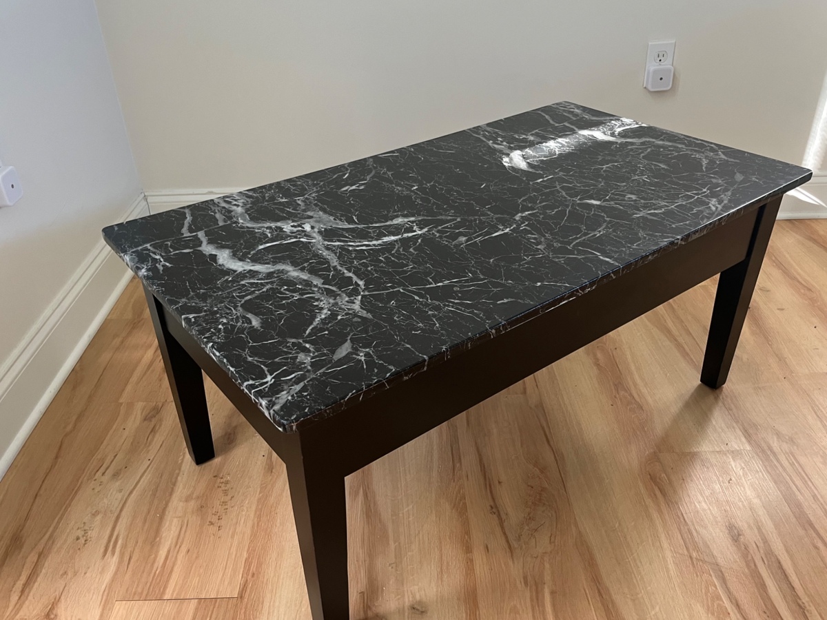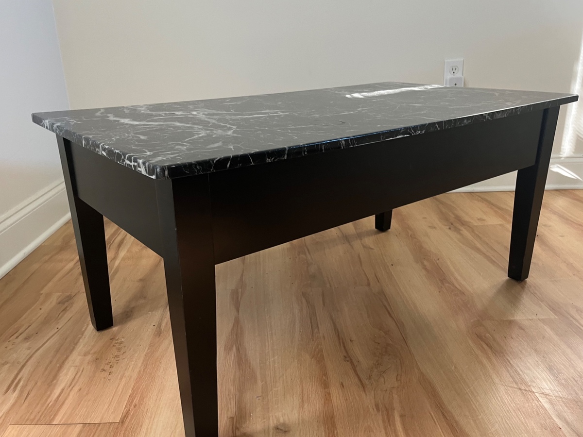 40”x22.5” coffee table with hinged tabletop for interior storage. Black veneer with faux marble finish. No exterior impressions in wood, some minor wear.