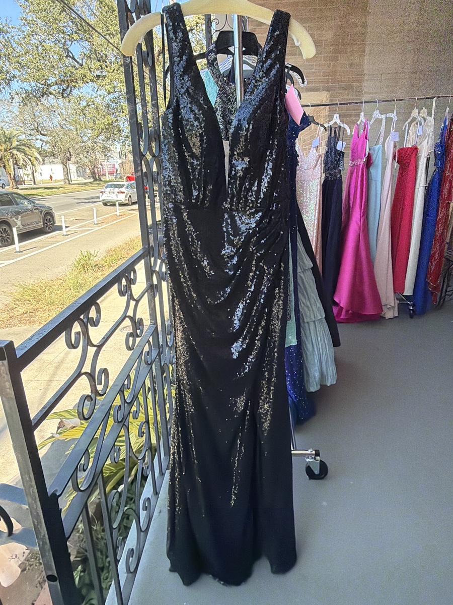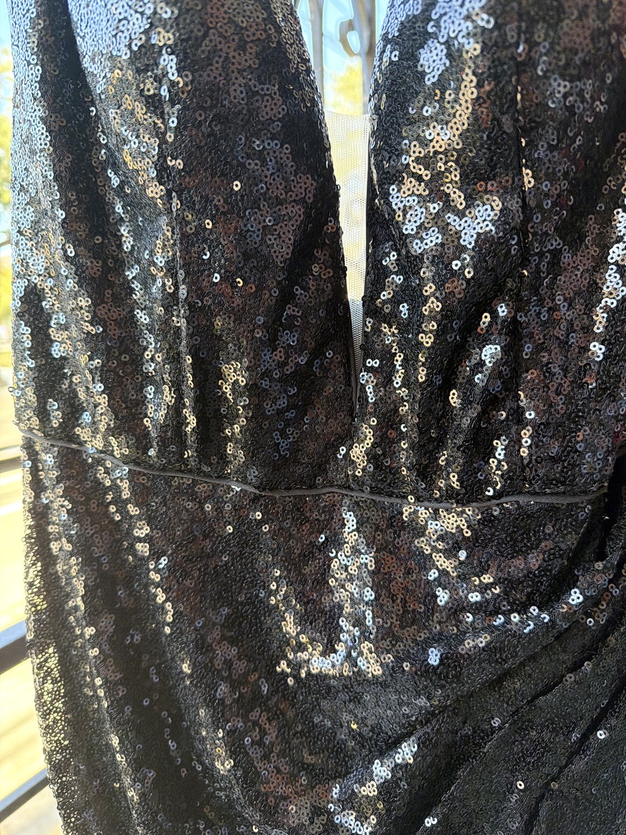 This elegant black sequin evening gown is perfect for formal events or special occasions. The dress features a flattering draped design and a deep V-neck, ensuring a sophisticated look. It's in excellent condition, with no visible signs of wear, offering both style and comfort for a night to remember.