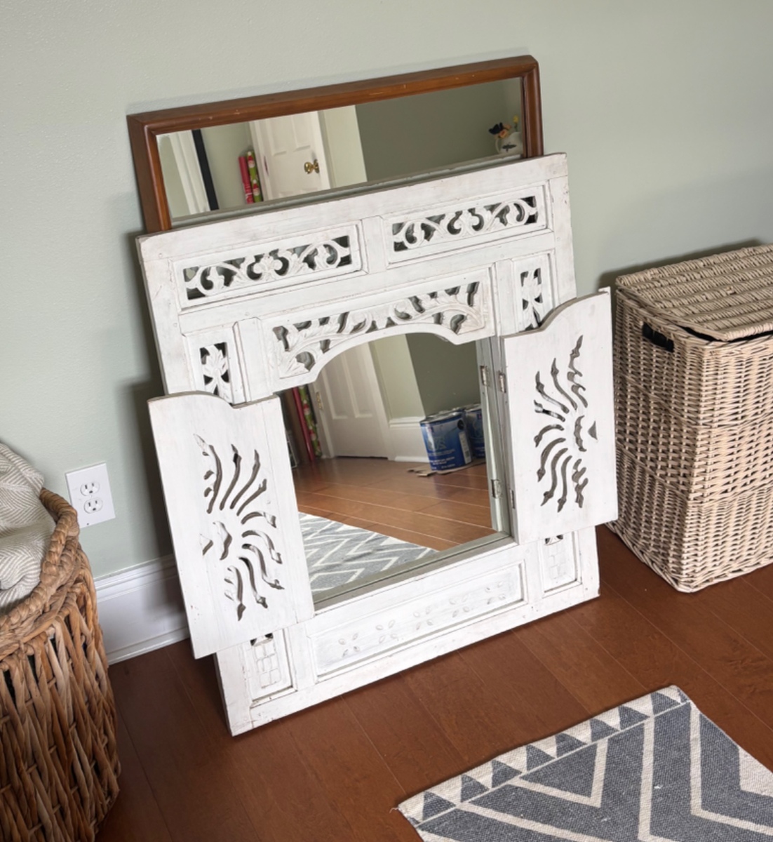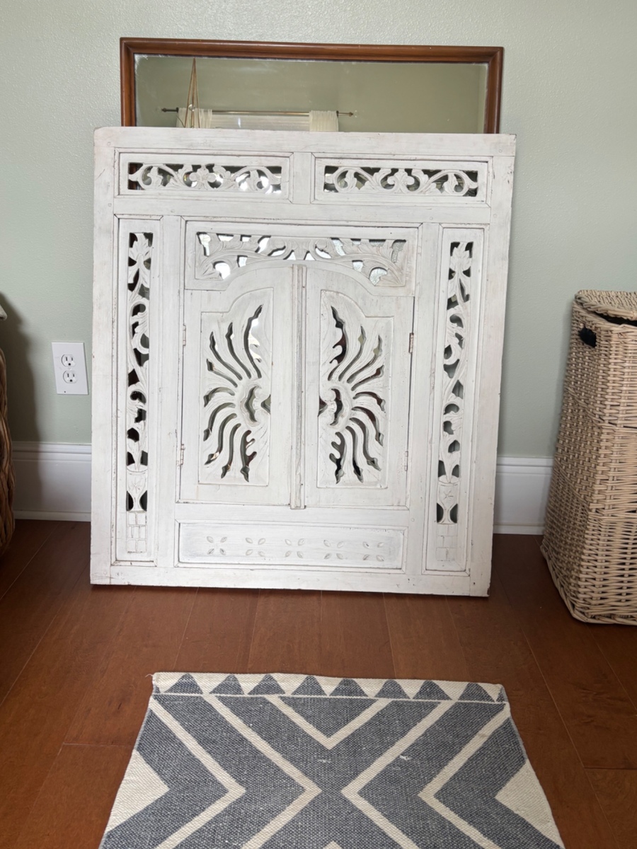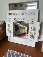 Decorative White Carved Wood Wall Mirror with Shutter Doors