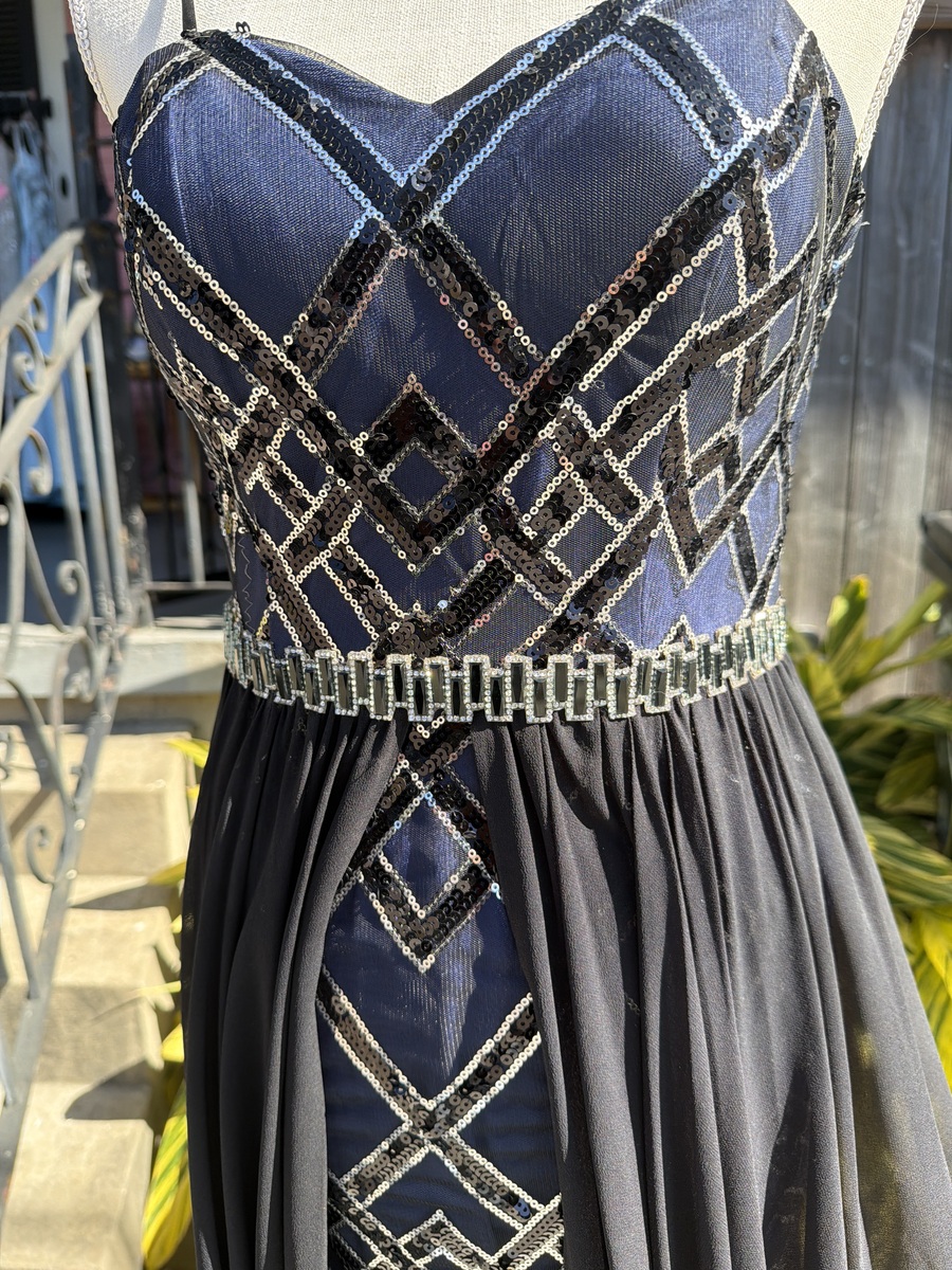 This elegant beaded gown features intricate geometric beadwork and a flowing chiffon skirt. Perfect for formal events, the dress is in excellent condition with no visible signs of wear. The top is fitted with a sweetheart neckline, and it has thin straps for a delicate look.