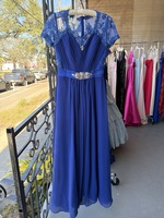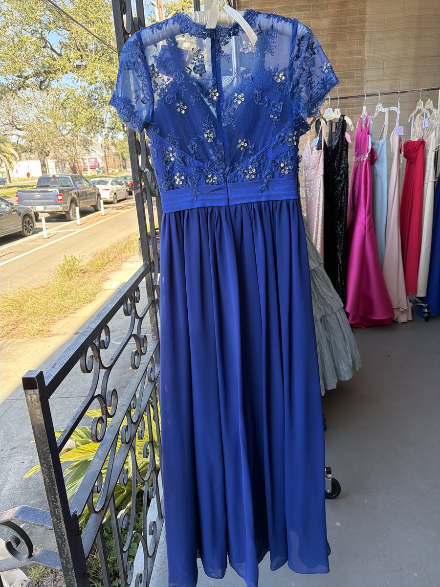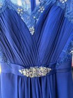 Stunning blue evening dress featuring intricate lace detailing and an embellished waistline. This floor-length gown is perfect for formal occasions and is in excellent condition. The delicate lace on the shoulders adds a sophisticated touch, making it a standout piece for any event.