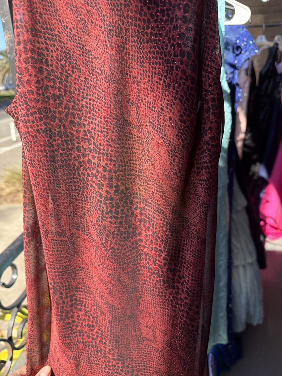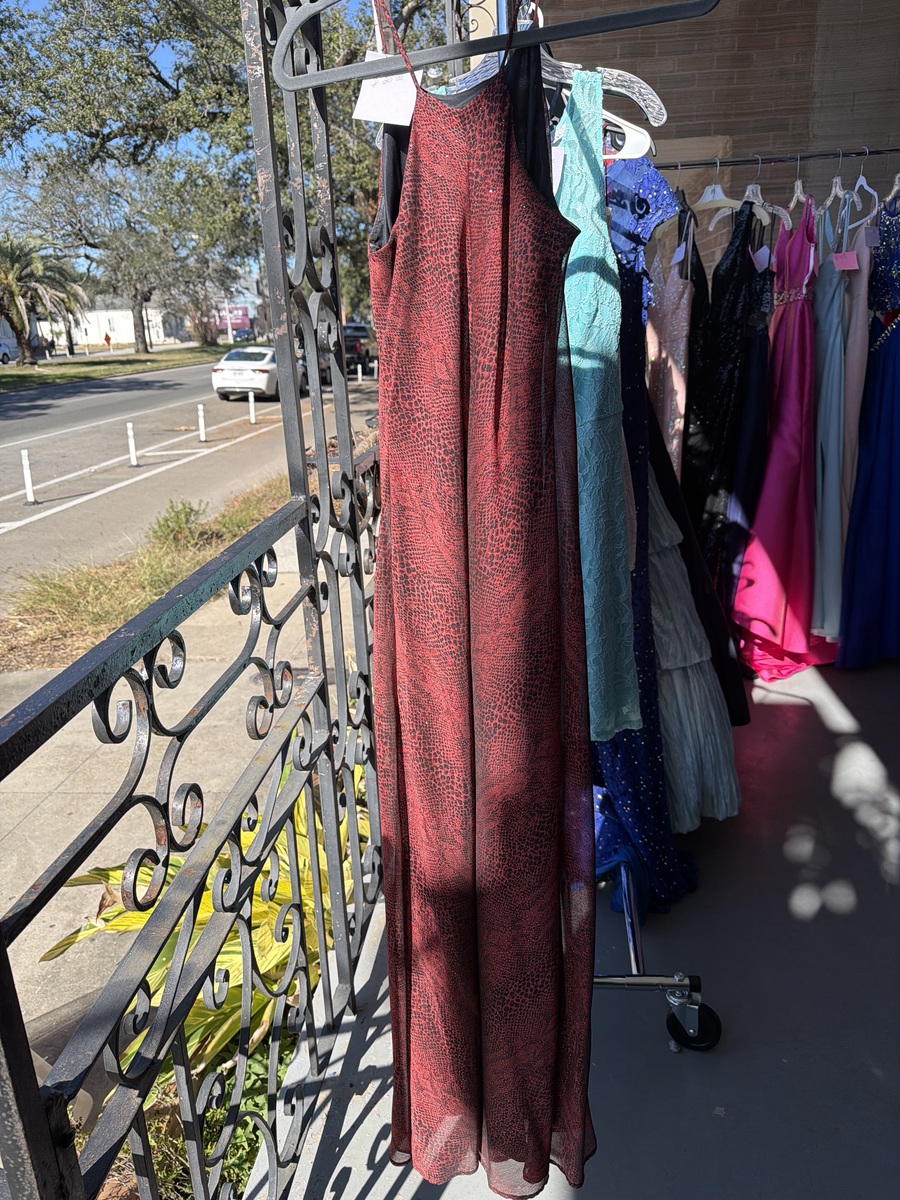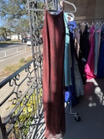 This elegant red evening dress features a sleek design with a subtle textured pattern. Perfect for formal occasions or a night out, it offers a flattering fit and timeless style. The dress is in excellent condition, having been gently worn and well cared for.