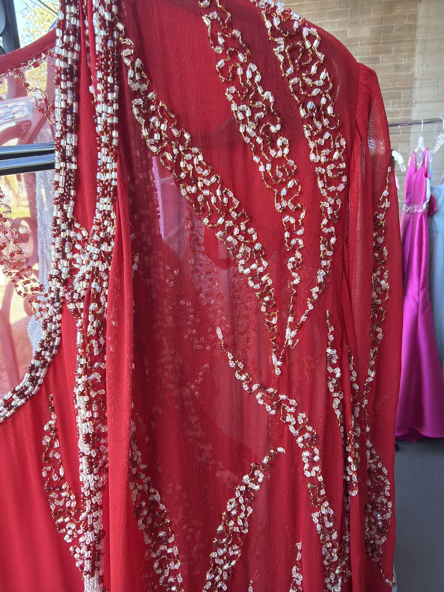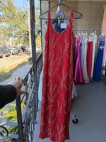 Stunning red evening gown featuring intricate gold sequin detailing. This sleeveless dress is perfect for formal occasions and promises to make a statement. The dress is in excellent condition, showing no signs of wear.