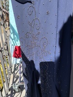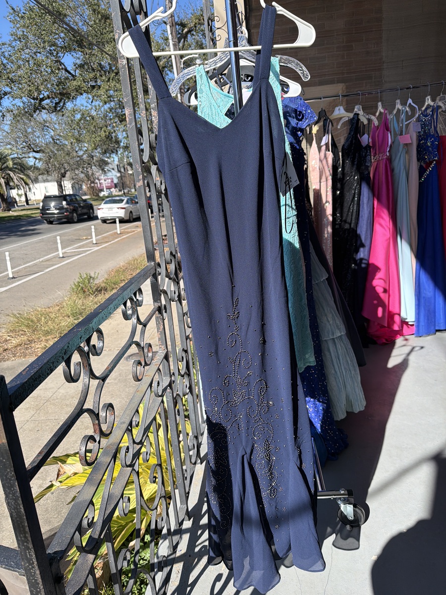 This stunning navy blue dress set features intricate sequin detailing for a touch of glamour. Perfect for formal occasions, it's in excellent condition and offers a sophisticated, timeless look. The set is made in the USA, ensuring quality craftsmanship. A beautiful addition to your wardrobe.
