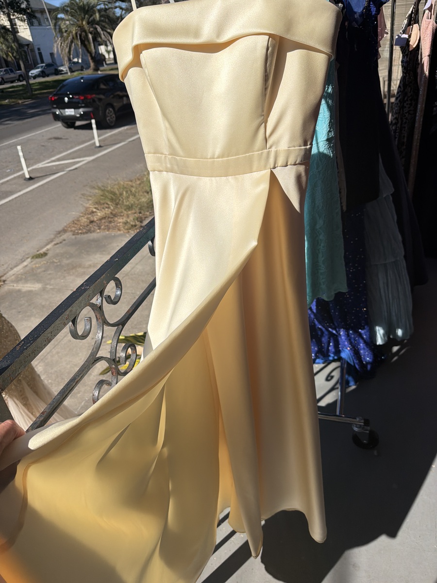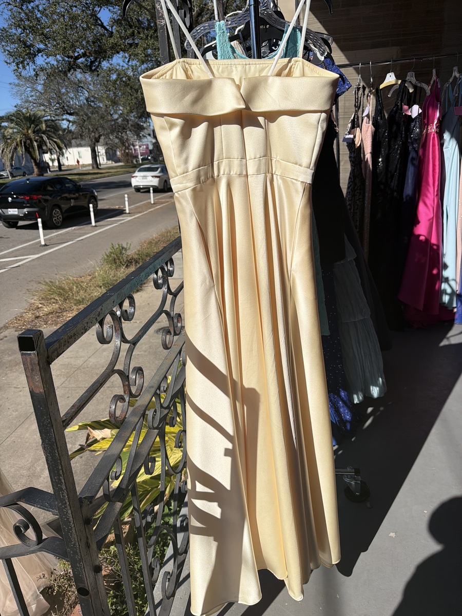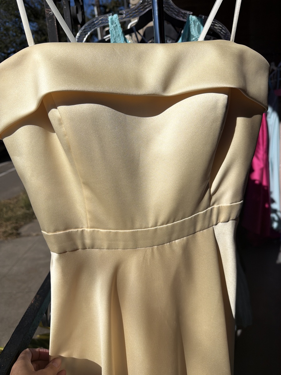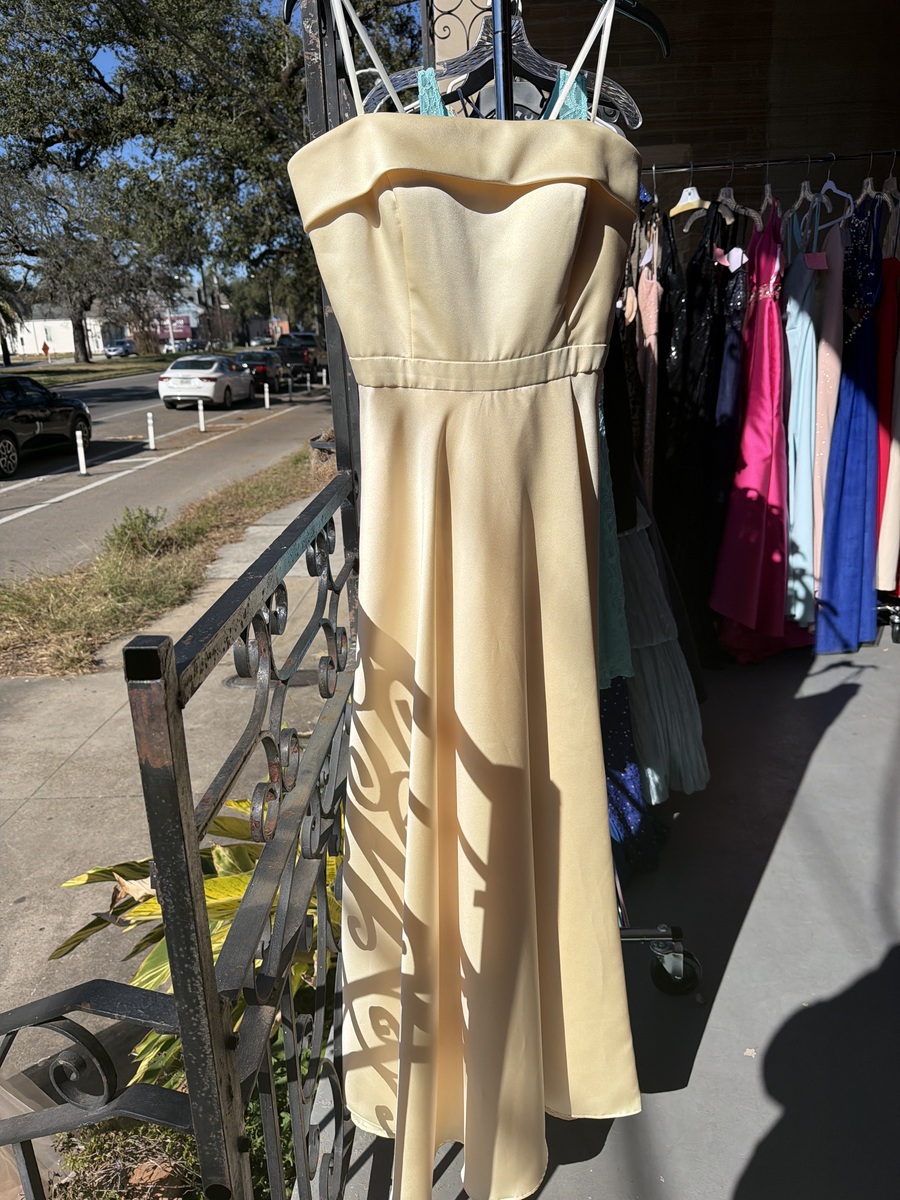 This elegant strapless dress features a smooth, flowing design perfect for formal occasions. The light, neutral color makes it versatile for accessorizing, while the fabric drapes beautifully. In excellent condition, with no visible signs of wear.