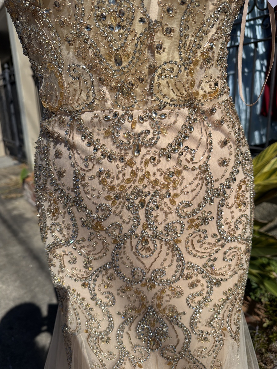 This stunning evening gown features intricate beadwork and a flowing tulle skirt, perfect for formal occasions or proms. The gown is in excellent condition with no visible wear and tear. Its flattering silhouette and exquisite details make it a standout piece for any wardrobe.