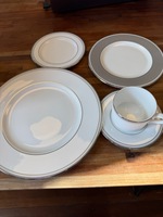 5 of the following 5-piece sets, new in box: Crafted of Lenox white bone china accented with precious platinum Dishwasher-safe Diameter of dinner plate: 10-3/4-inch, salad plate: 8-inch, butter plate: 6-inch, saucer: 5-3/4-inch; capacity of cup: 6 ounce Includes dinner plate, salad plate, butter plate, cup, and saucer