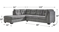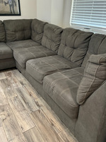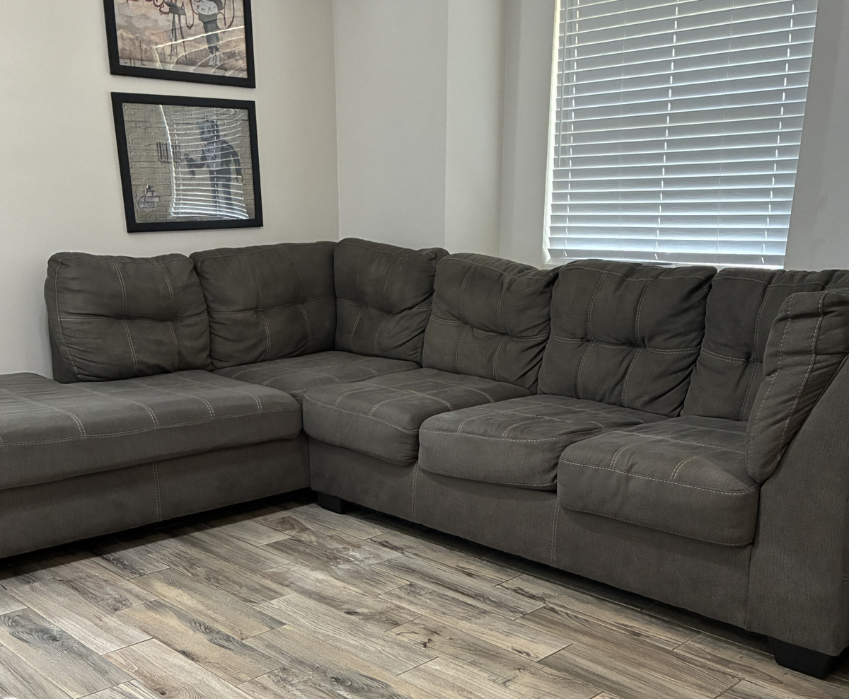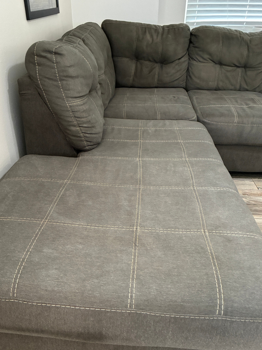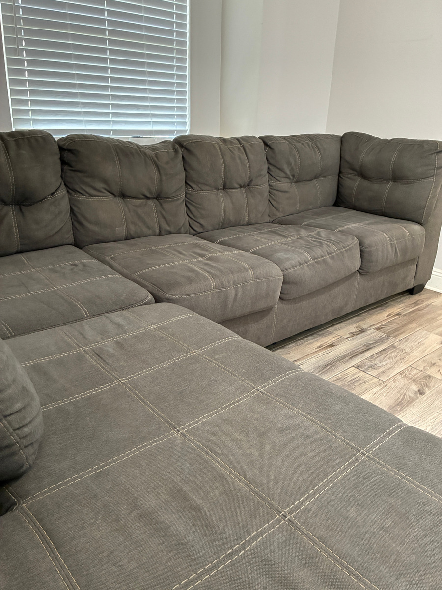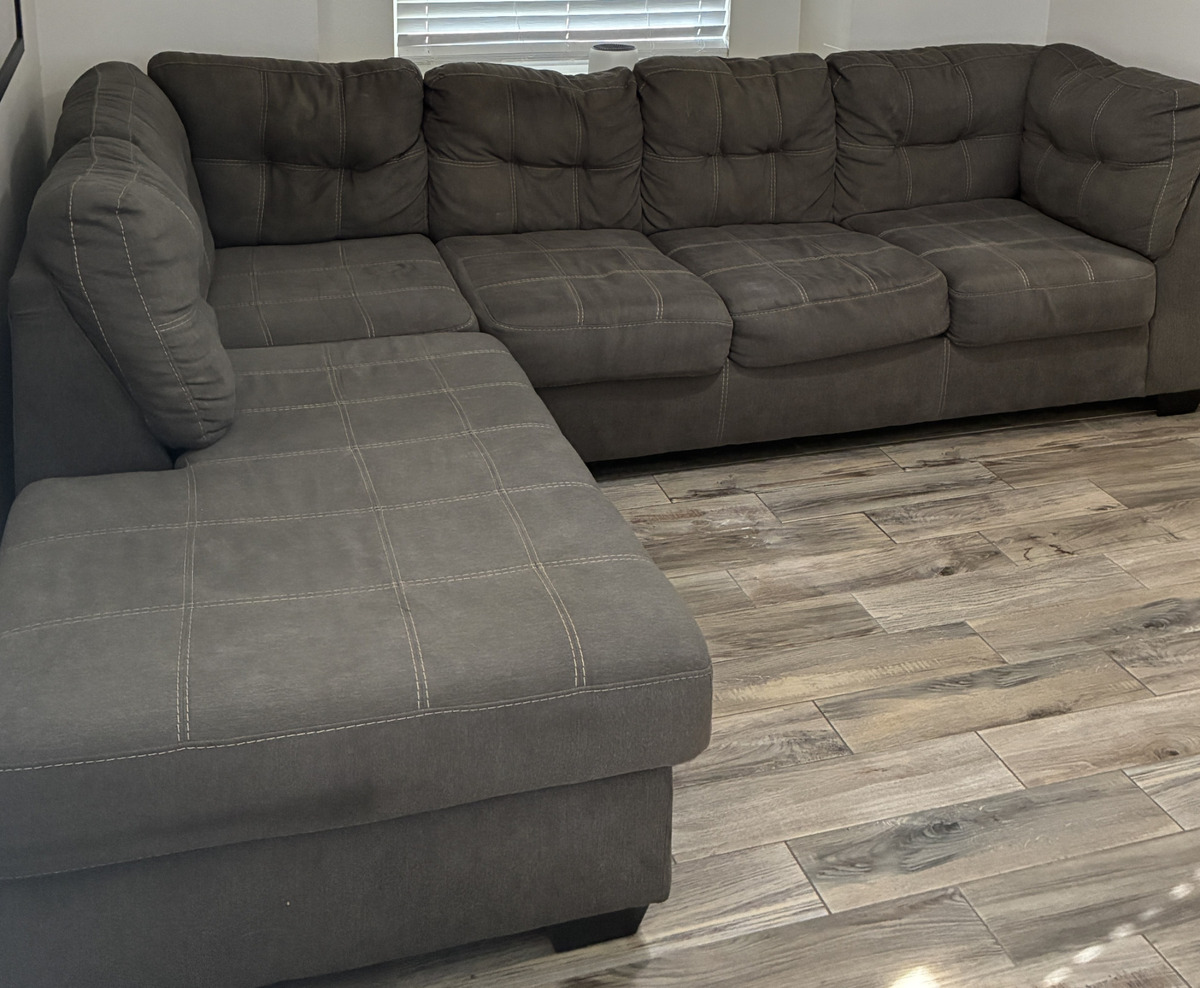Selling a comfortable 2-piece Ashley Furniture sectional with left-facing chaise. Spacious and comfortable, it features plush cushions and durable upholstery, ideal for family gatherings or lounging. The sofa has some signs of wear, but generally in great condition. We are a pet friendly home. Our fur baby has been allowed on the couch with a cover. Decorative stitching on the side of one seat cushion is loose, but it does not affect the functionality and is barely noticeable. - 2 pieces, approx 80-90" (for transport) - Approx. 113” W x 90” D x 38” H - Pet-friendly home (used with seat cover) - Very comfortable, great for lounging - Seat cushions are removable, back cushions are fixed. - Moving - Available for showings immediately, but pickup only 5/25-31 Local pickup only.