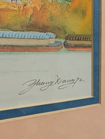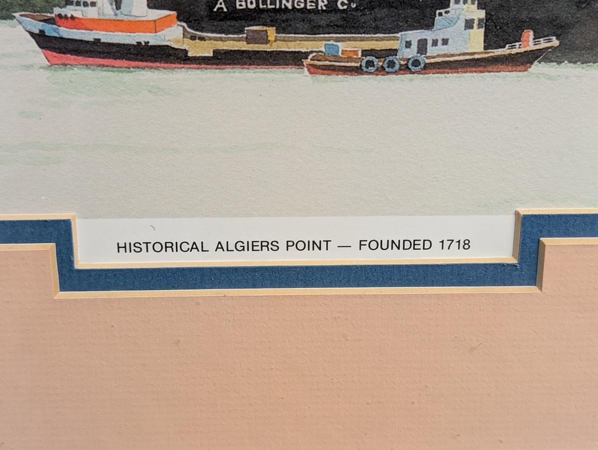 This is a framed print of historic Algiers Point as painted by Zhang Xiang, framed by a local Gretna framer. Print has some wear on it from age but is in overall good condition.