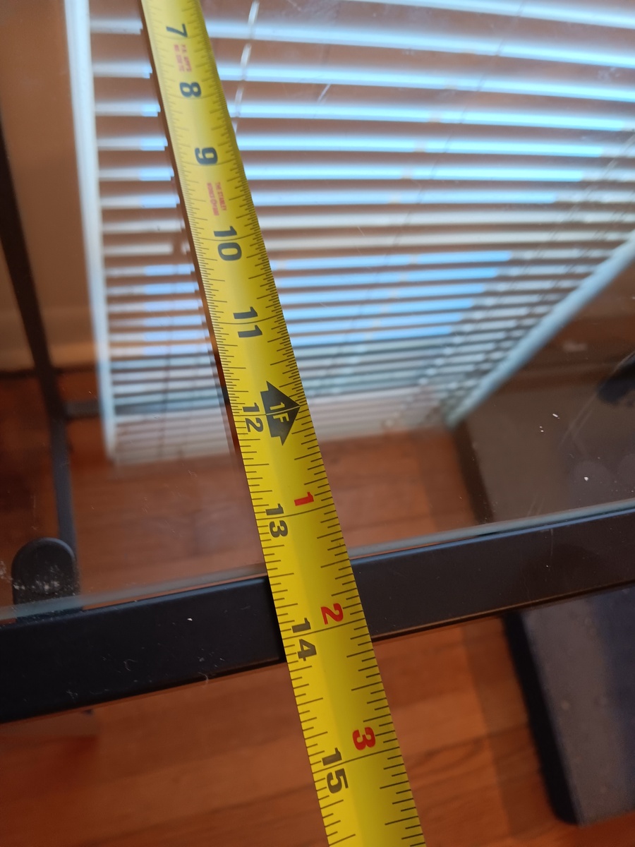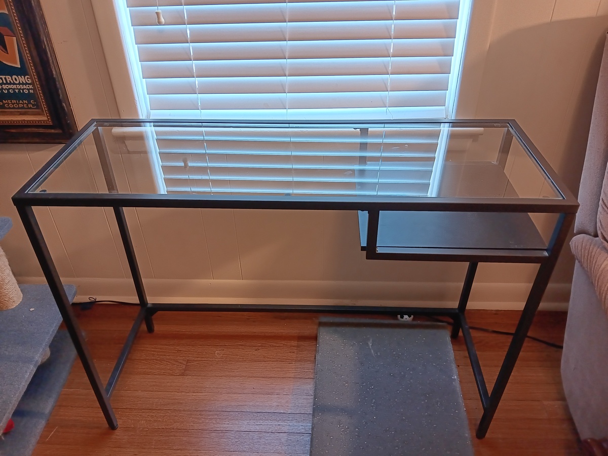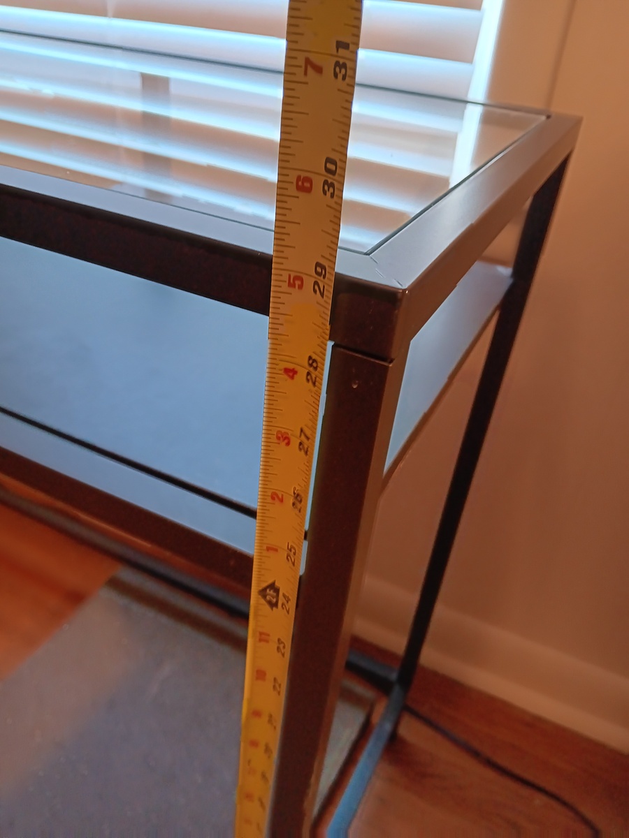 $15.00 67% offCool IKEA side table with glass top. Metal frame. Nifty for a narrow entry-way or a shotgun home. Check out measurements in the pictures. Smoke free home, but 2 cute cats have been known to take naps on this from time to time. No obvious defects as far as I can tell