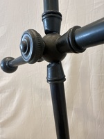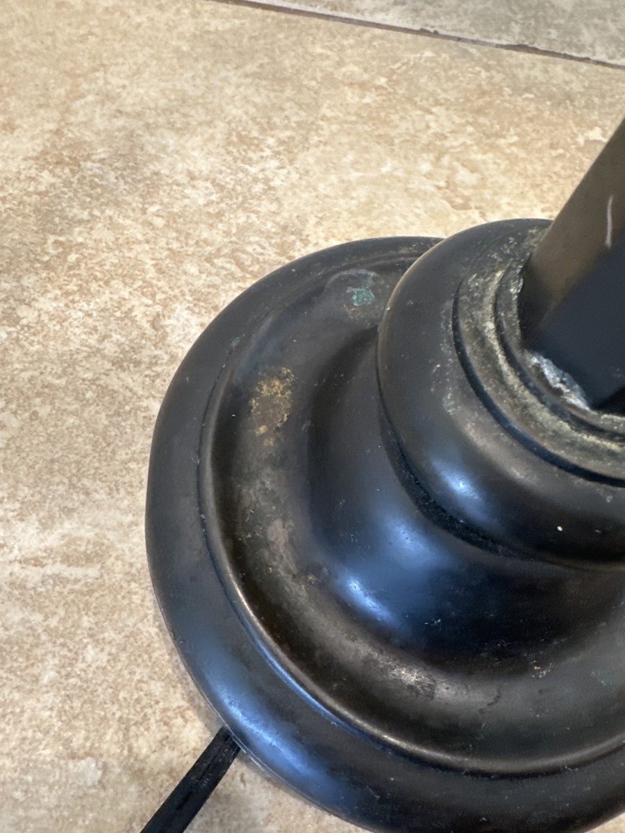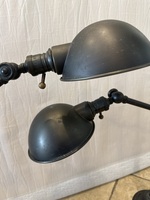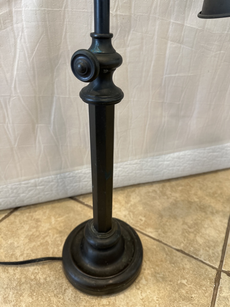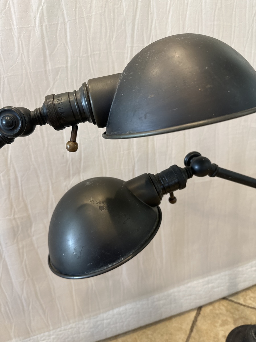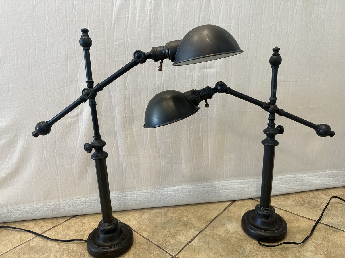 Gorgeous heavy lamps, premium construction. 27” long arms, 26” tall, black, solid metal. Some patina- spots, tarnish, tiny chips. Arms,!shades, and shaft are adjustable and can be positioned higher/lower, tilted, and rotated.