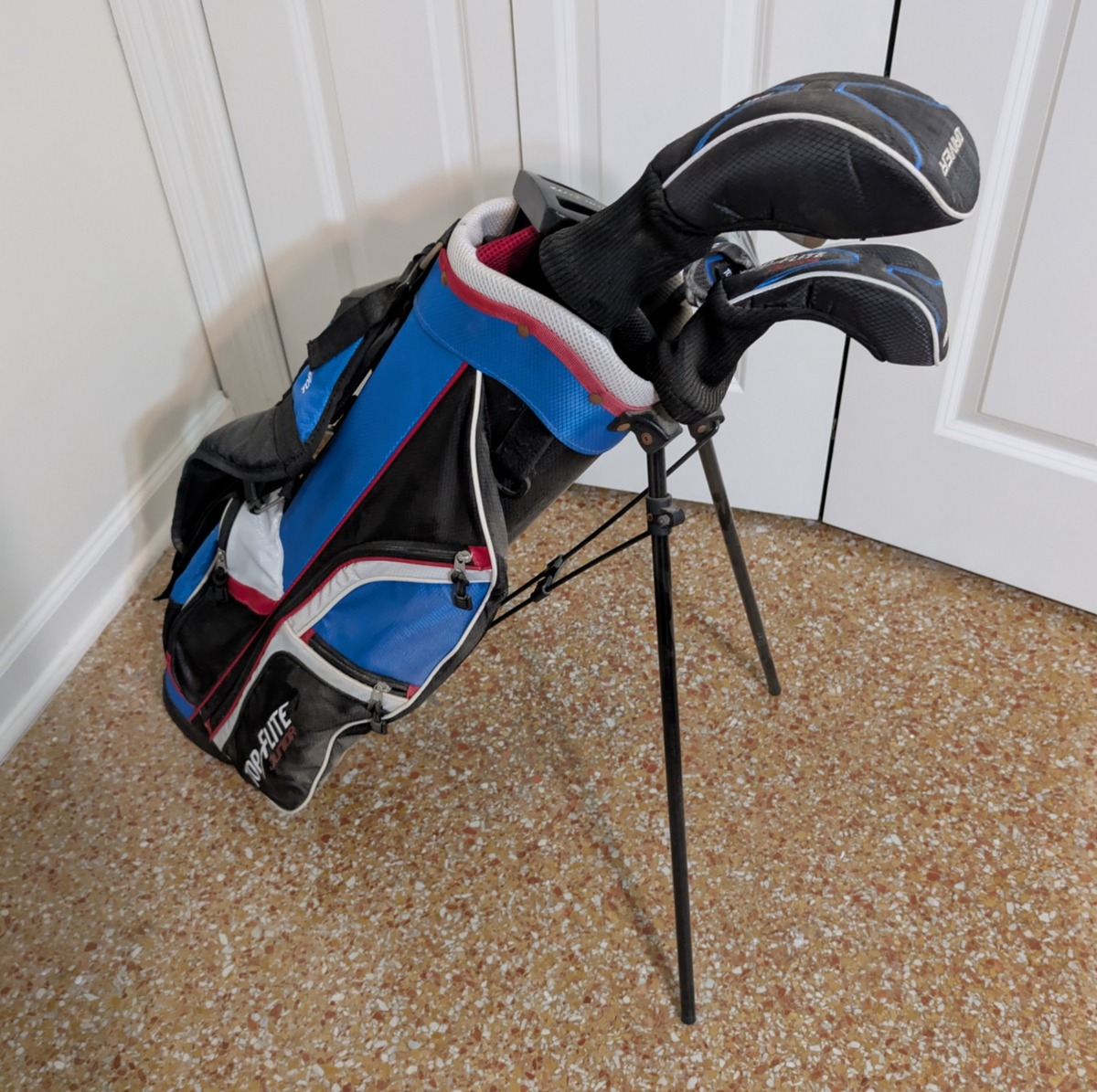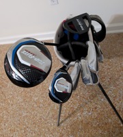 Kid's set with putter, 7-iron, sand wedge, hybrid wood, and driver. Bag included.