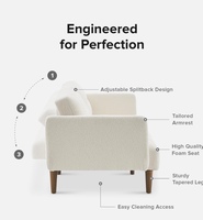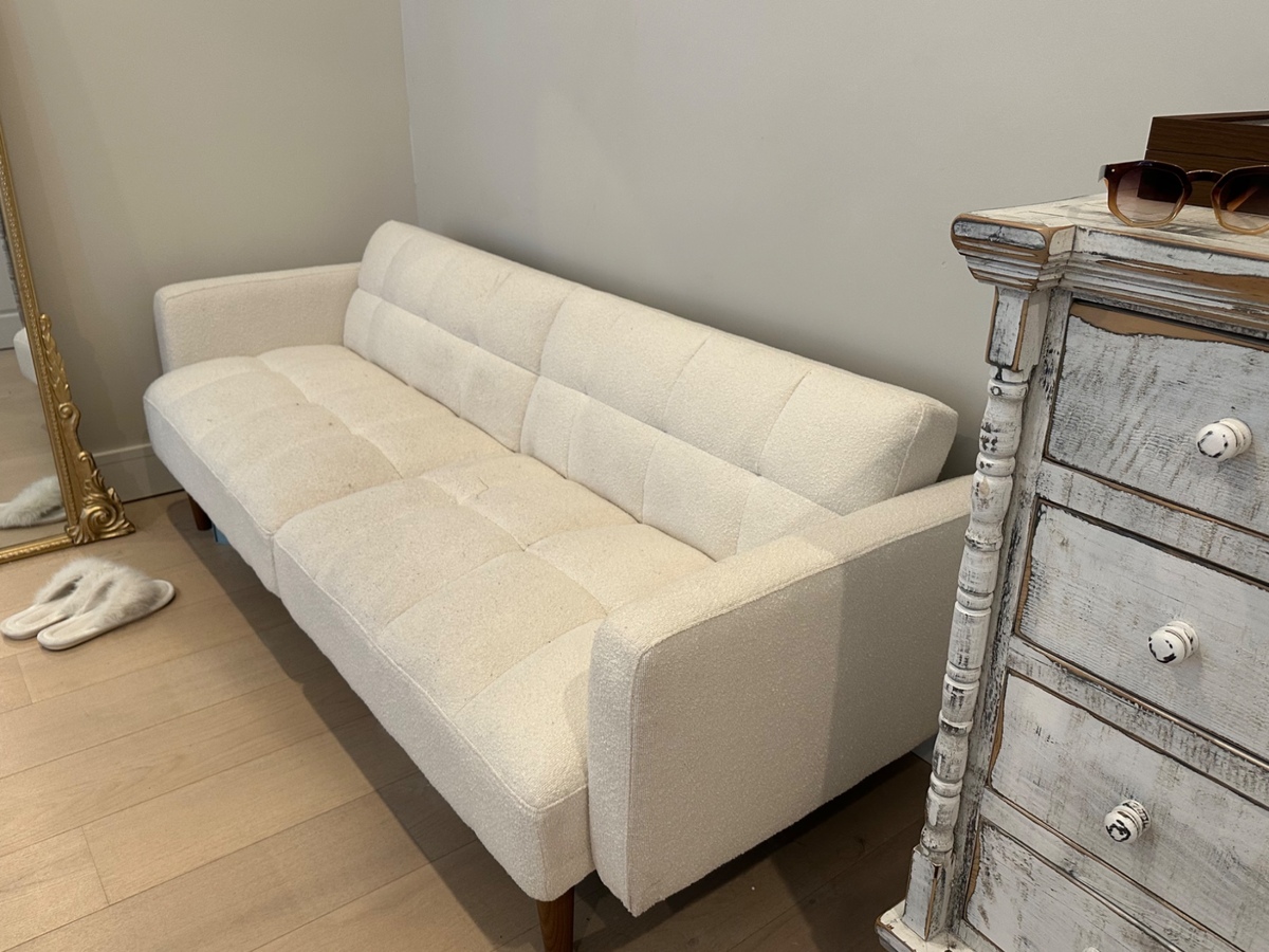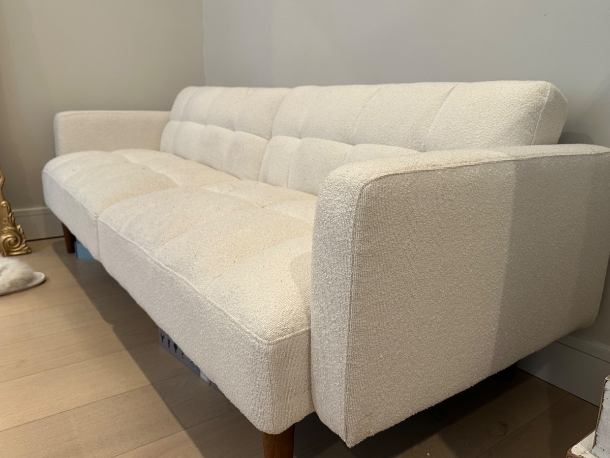 $150.00 33% off OBOThis modern white adjustable futon offers a sleek and comfortable design that's perfect for any living room. It features a soft, textured fabric and sturdy wooden legs, providing both style and durability. Spill resistant, boucle material