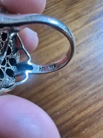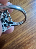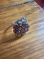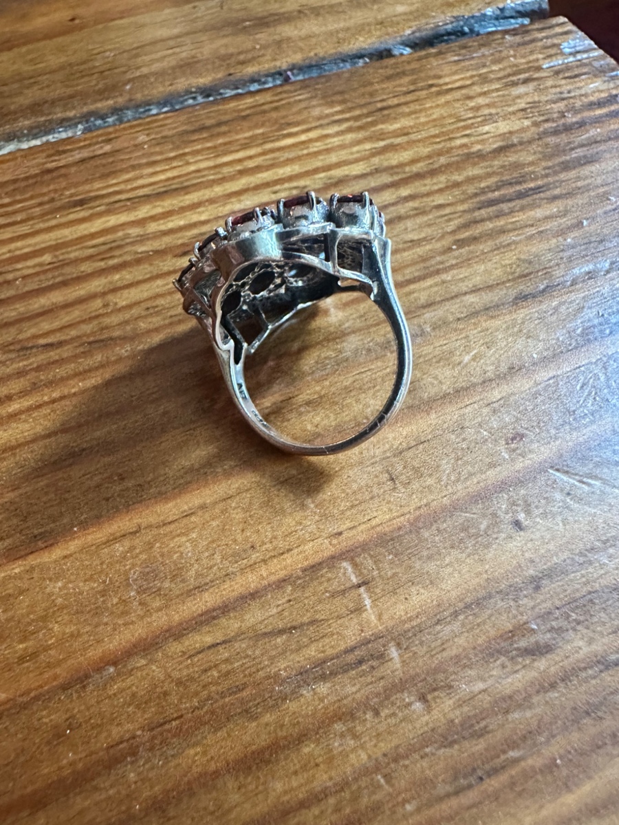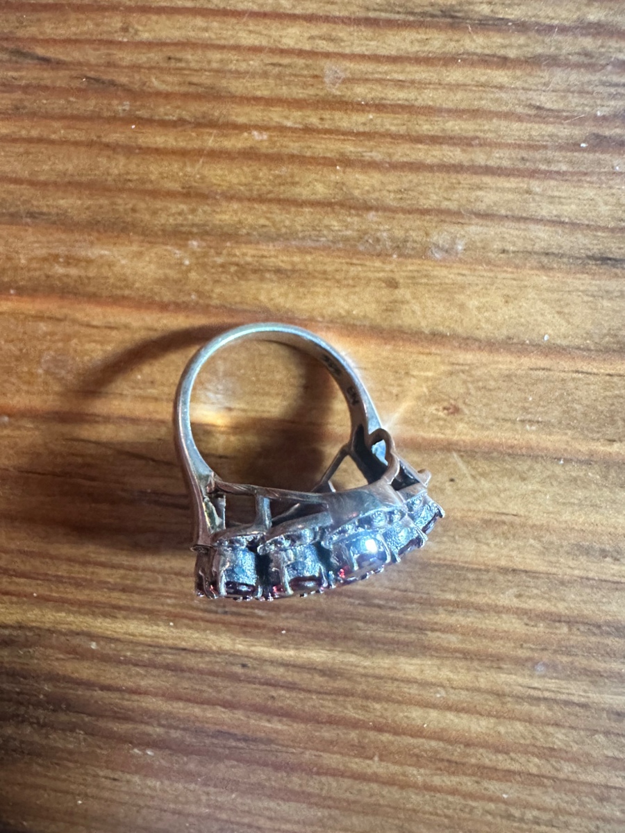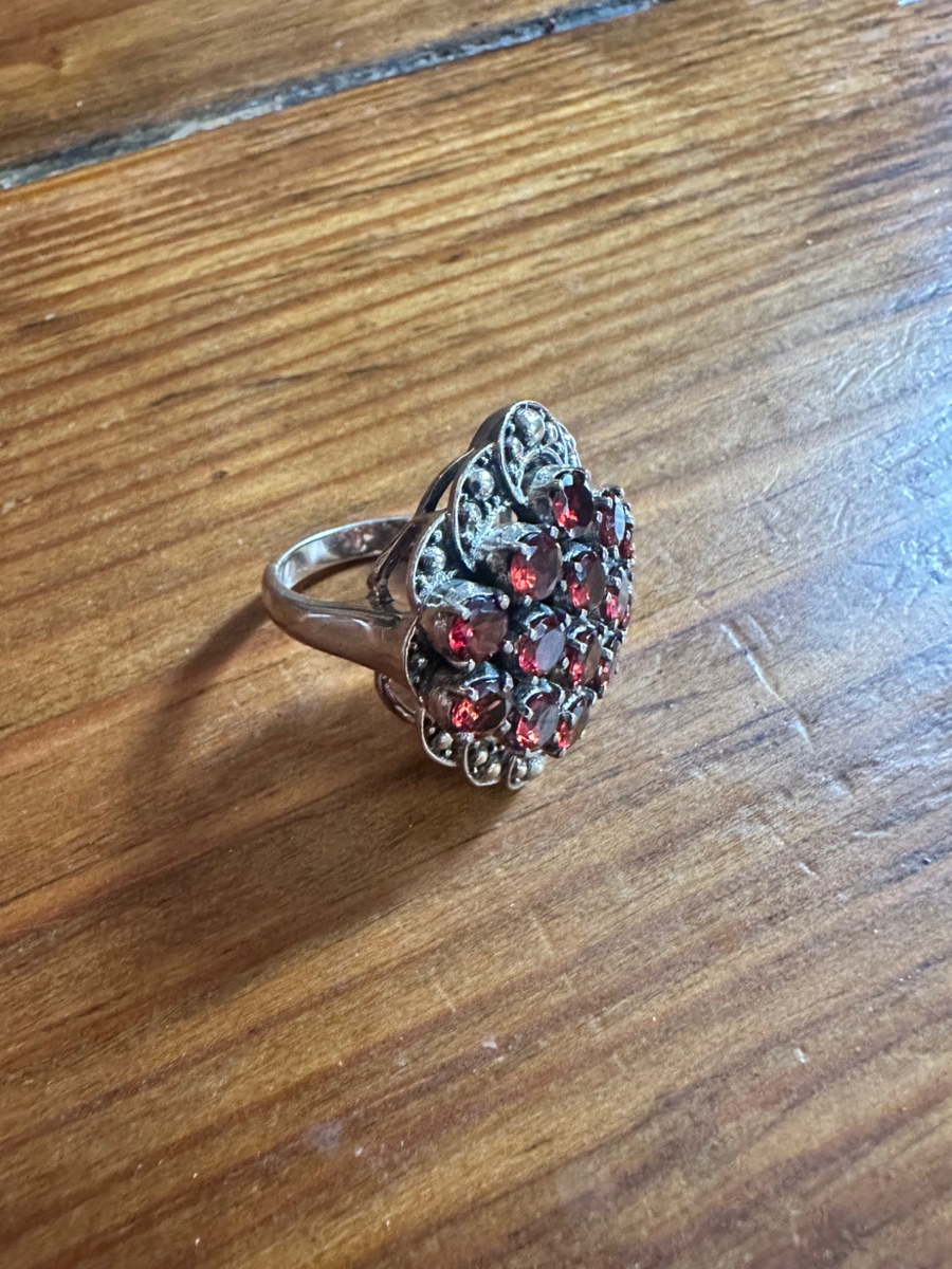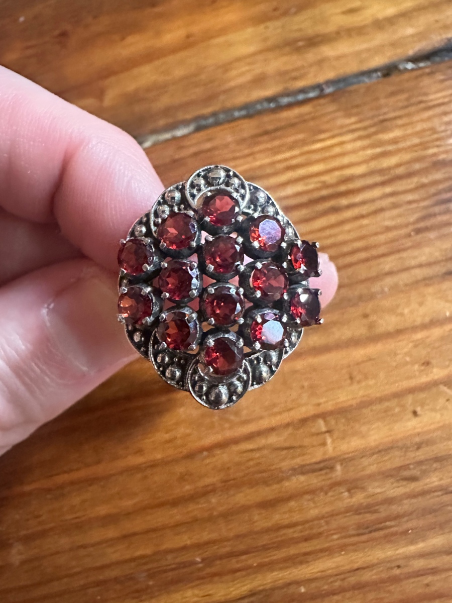 Selling a women’s size 7 sterling silver antique garnet cluster ring. The listing said it was made between 1935-1950. Bought it as a present but it was a little too big. I don’t see any visible flaws and appears in excellent condition. Let me know if you have any questions.