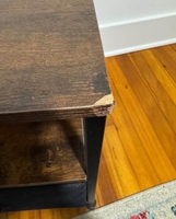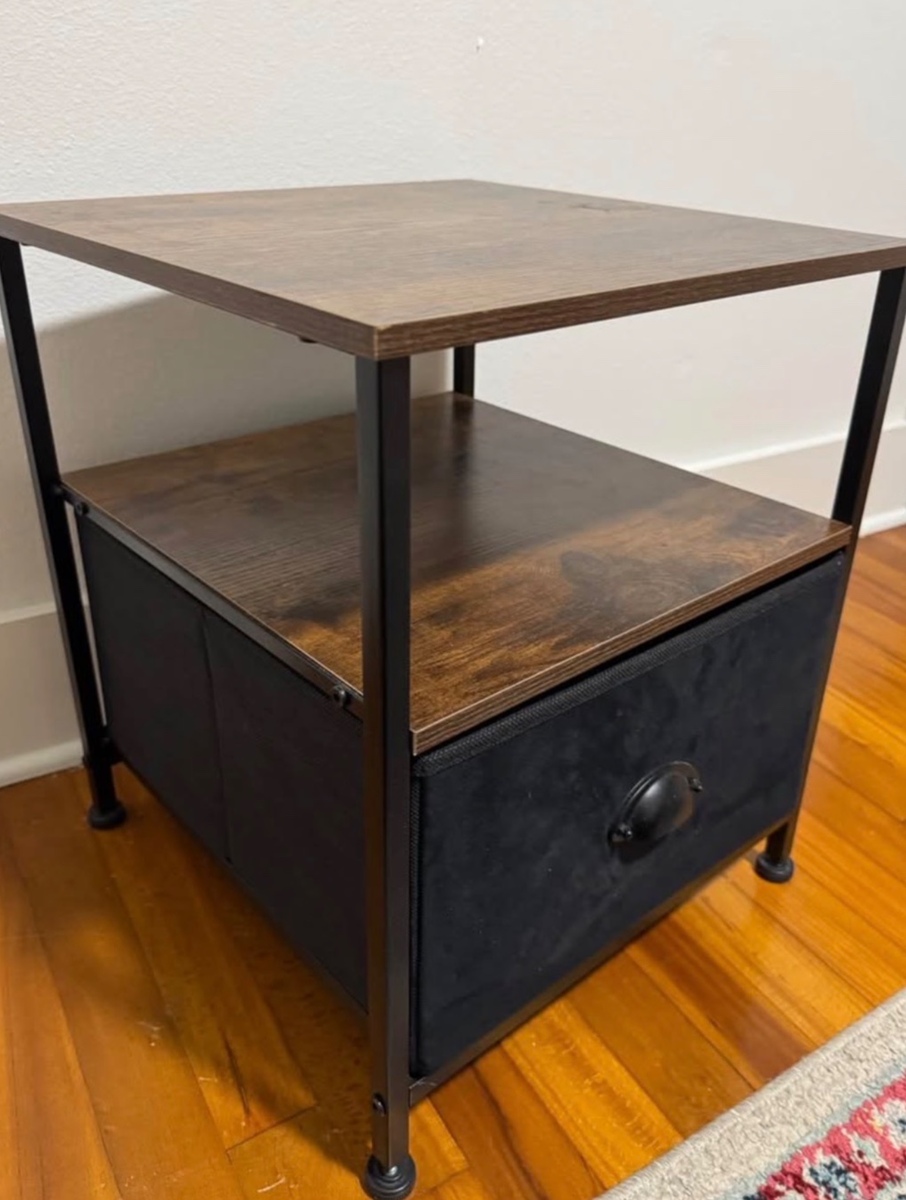 This brown nightstand is in great shape and fully functional. It has a nice deep cloth drawer that offers plenty of storage. There is one small chip on a corner, but it doesn’t affect use and everything else is perfectly fine. Originally purchased on Amazon. Dimensions: • Width: 16” • Depth: 16” • Height: 19” Sturdy, compact, and perfect for bedside storage or small spaces.