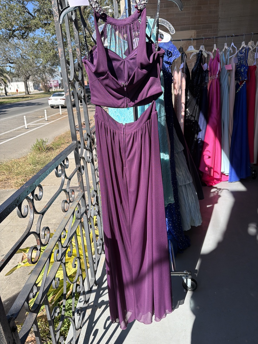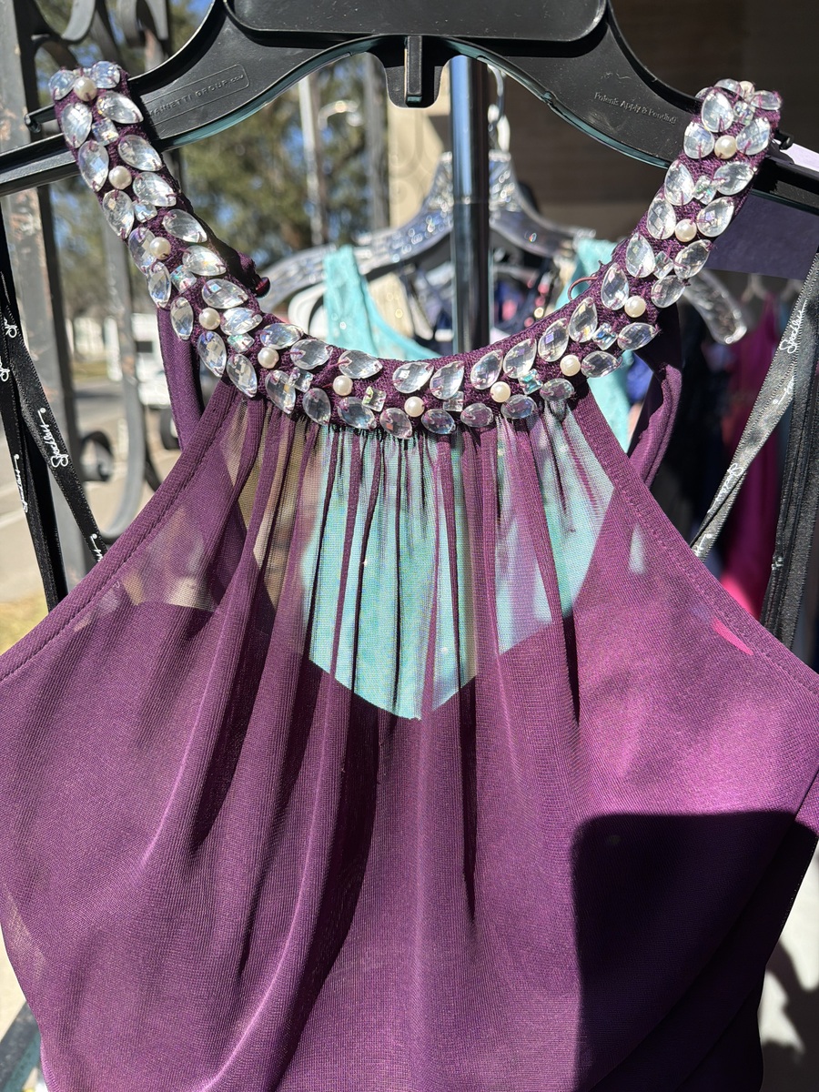 Stunning purple evening gown featuring an elegant jeweled neckline and a flowing skirt. Perfect for formal events, this dress is in excellent condition with no visible signs of wear. The rich color and stylish design make it a standout choice for any special occasion.