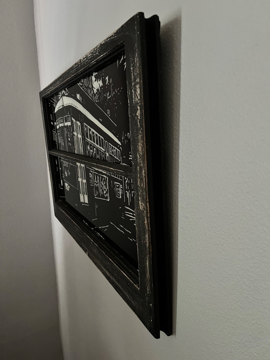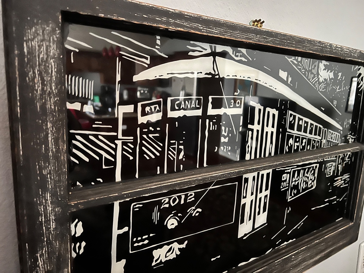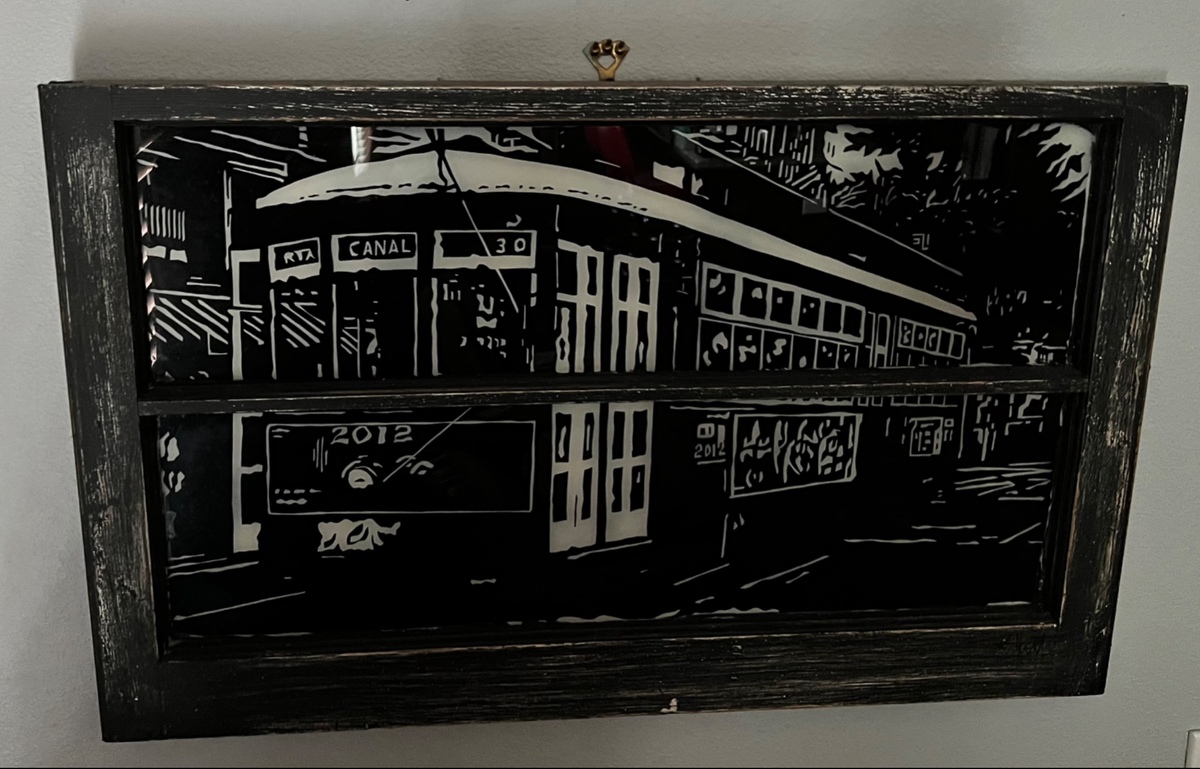 $100.00 25% off OBOOriginal artwork by Jeremy Hebert of New Orleans. Canal line streetcar painted on reclaimed double paned window. Dimensions approximately 20 x 32. Note: Slight imperfection in glass as noted in image #4