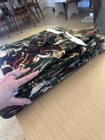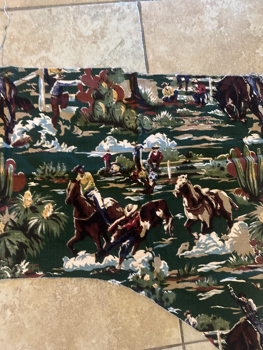 Totally awesome cowboy and desert scene print with cacti, broncos, fringed chaps, cattle, the works! Real Cowboy Curtis masc vibes. 🤠 Couple large pieces, maybe a yard each? and a few odd shaped scraps. Thick and sturdy fabric meant for upholstery curtains etc.