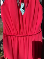 This elegant pink evening gown features a striking halter neckline and a flowing silhouette, perfect for formal occasions. The dress is in excellent condition, free from any visible imperfections, and offers a graceful, timeless style. Ideal for weddings, proms, or any special event.