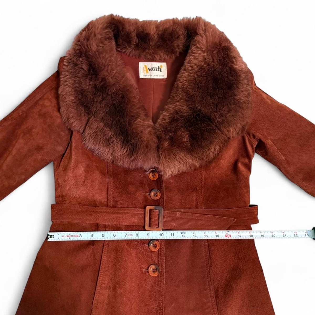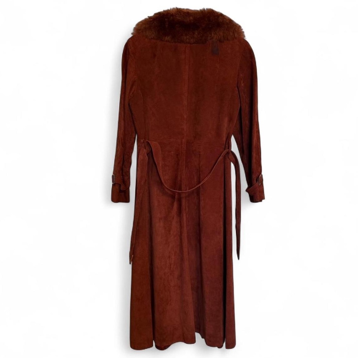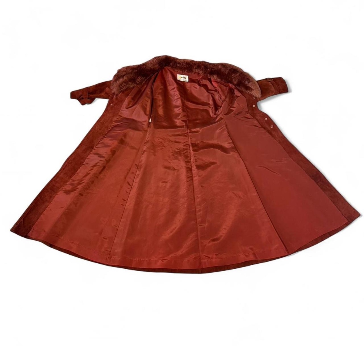 Vintage 70s Suede Maxi Coat w/ Faux Fur Shawl Collar (Size 12) Stunning true 1970s suede long coat featuring a dramatic oversized faux-fur shawl collar, belted waist, and full A-line silhouette. Super flattering, warm, and iconic — the perfect statement winter coat. Details: • Genuine suede body • Faux fur collar (super soft) • Button front closure • Matching suede waist belt • Buckle details at sleeves • Fully lined • Rich rust / Brick red suede / warm burgundy / burnt red color • Beautiful vintage condition with normal light wear for age Size: Tagged 12 Best fit: M/L depending on desired layering (see measurements) Measurements: • Length (top to bottom): 47” • Waist (laid flat): 18” • Sleeve (armpit to cuff): 15” There is a dark mark on the back upper right near the shoulder, looks like it could be an iron mark? Style vibes: Penny Lane, Almost Famous, 70s retro, boho, witchy winter, statement coat, Y2K revival