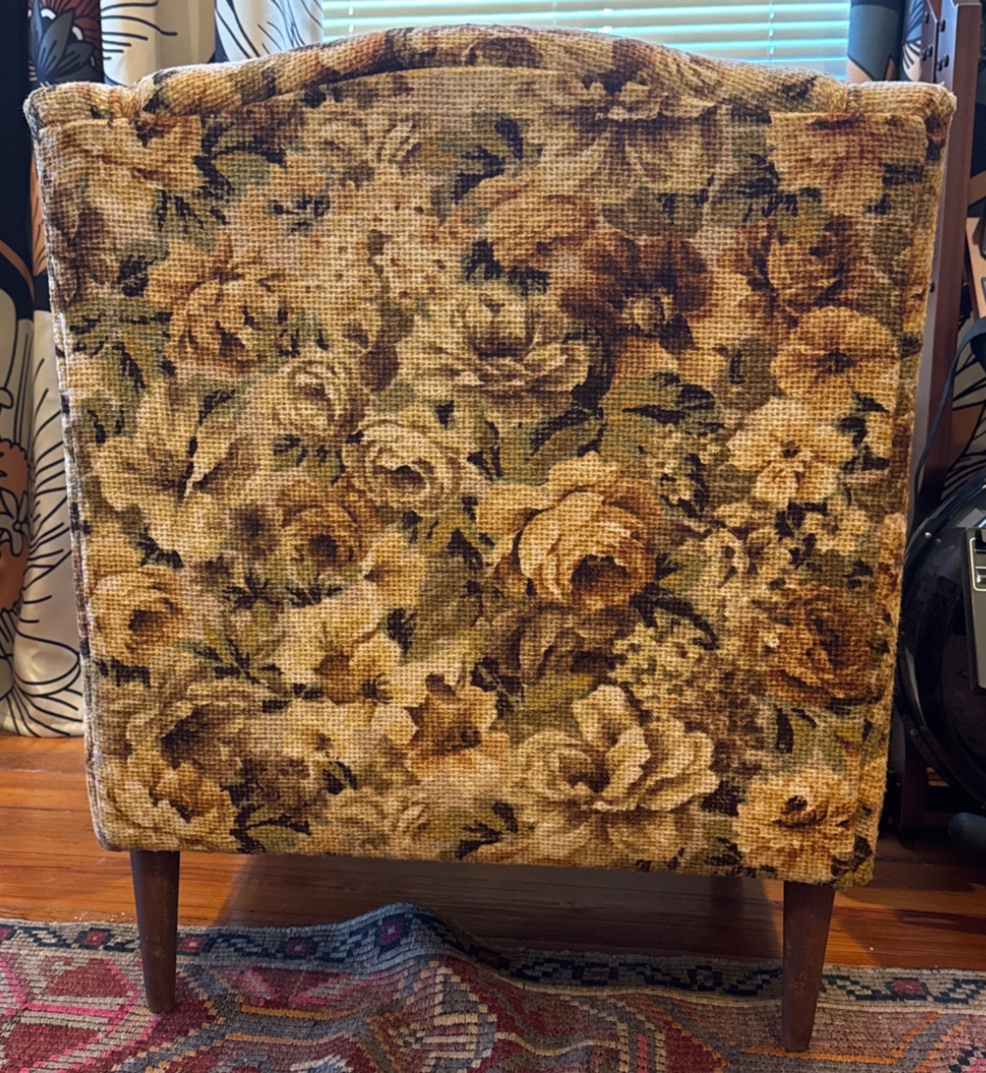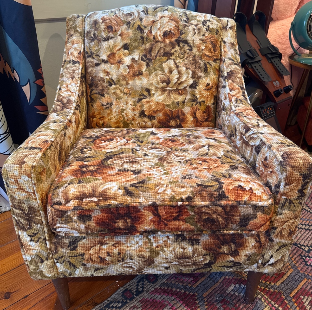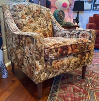 OBOThis vintage armchair features a charming floral pattern, perfect for adding a touch of retro style to any room. The upholstery is vibrant, and the wooden legs are sturdy, showing minimal signs of wear. Ideal for cozy reading nooks or as a statement piece, this chair offers both comfort and aesthetic appeal. Height (back) - 31” Height (seat) - 17” Depth - 27” Width - 27”