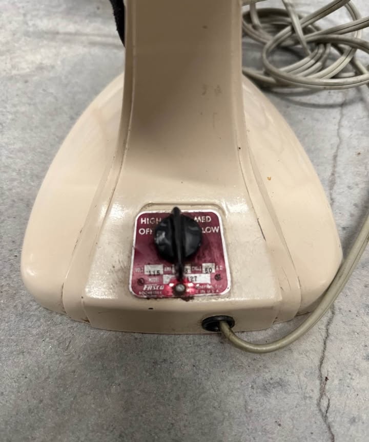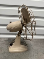 OBO Working condition, multi settings. Super quiet, white noise sound. Bring classic mid-century charm into your space with this vintage metal oscillating fan. Featuring a heavy steel base, metal cage, and four-blade design, this fan has that perfect industrial + retro aesthetic. Great as décor, a restoration project, photo prop, or for collectors of antique appliances. Height: 17" Width: 14" Length: 11" Details • Era: Likely 1940s–1950s • Material: All-metal construction (blades, cage, body) • Color: Cream / beige • Condition: • Cosmetic wear consistent with age — patina, scuffs, small rust spots (adds character) • Cord intact • Style: Mid-century industrial, Art Deco influence Perfect For • Vintage décor lovers • Photo studios / film props • Restoration hobbyists • Collectors of antique fans or industrial design pieces