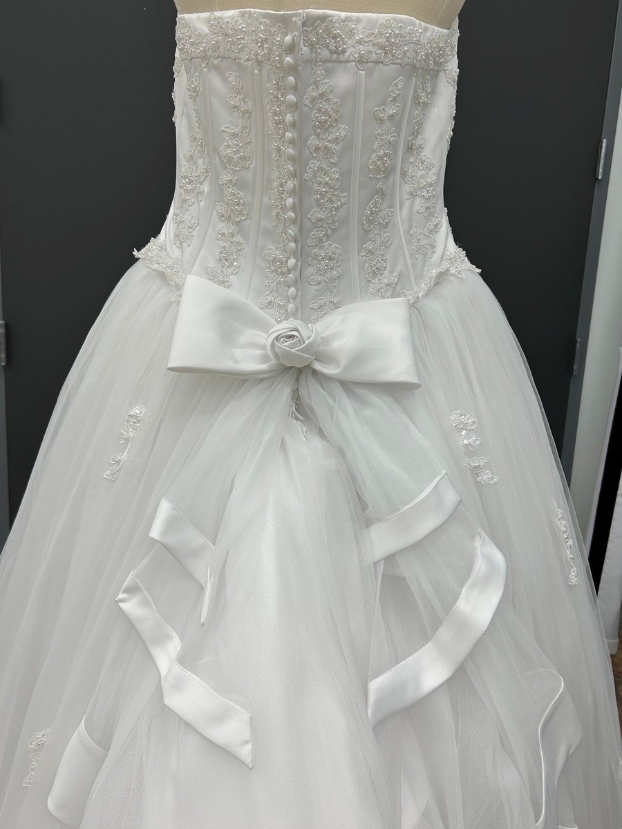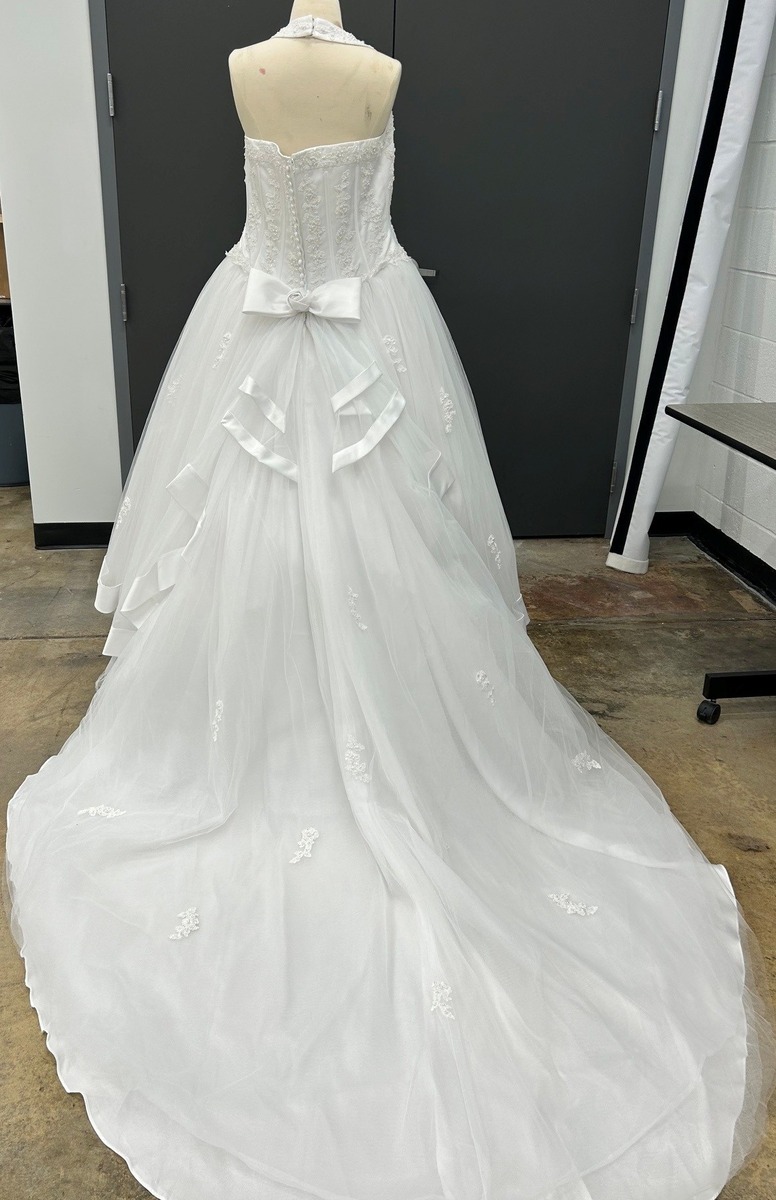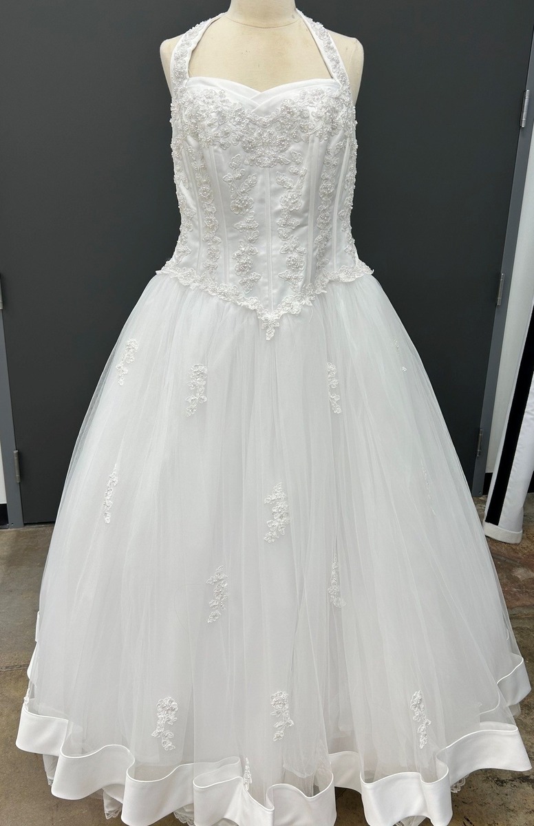 White satin halter with tiered tulle skirt featuring corset bodice and beaded lace appliques. Satin ribbon around hem. Crinoline included. David's Bridal size 14 - Originally $599 (plus alterations). I'm 5'1" so the hem is fairly short. Great for a wedding or photo shoot. Veil also available. You can try it on!