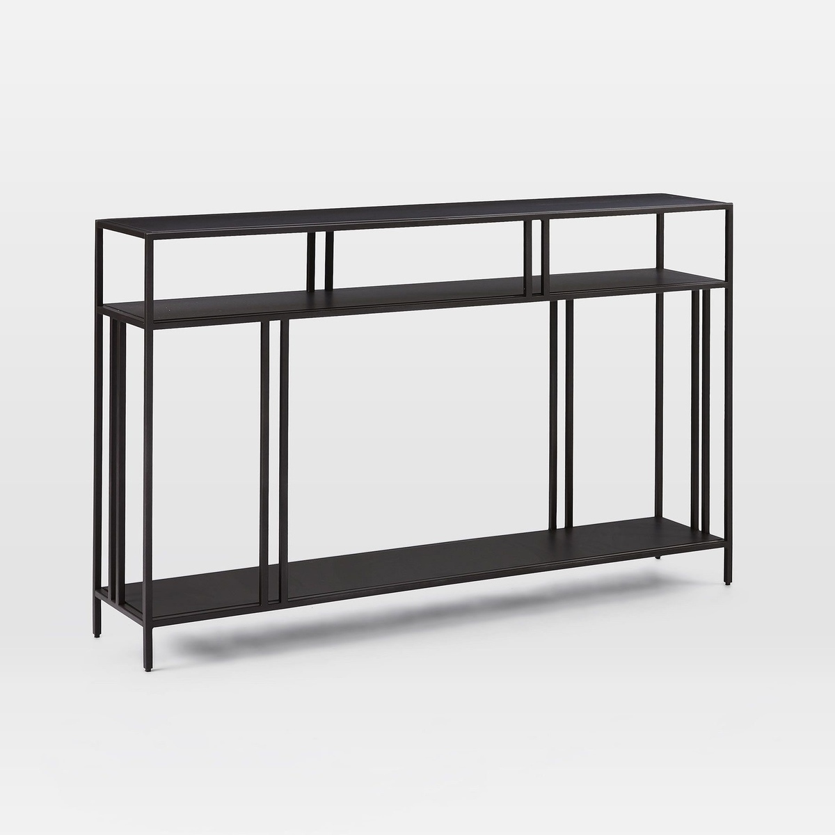 $200.00 25% off OBOIron top and base. Legs feature adjustable levelers to adapt to varying floor levels. Overall: 48"w x 10"d x 29.4"h. Top to shelf: 5.5". Distance between shelves: 19.5". Clearance: 3". Weight capacity: 120 lbs. (top); 28 (top shelf); 70 (bottom shelf). Sells for $399