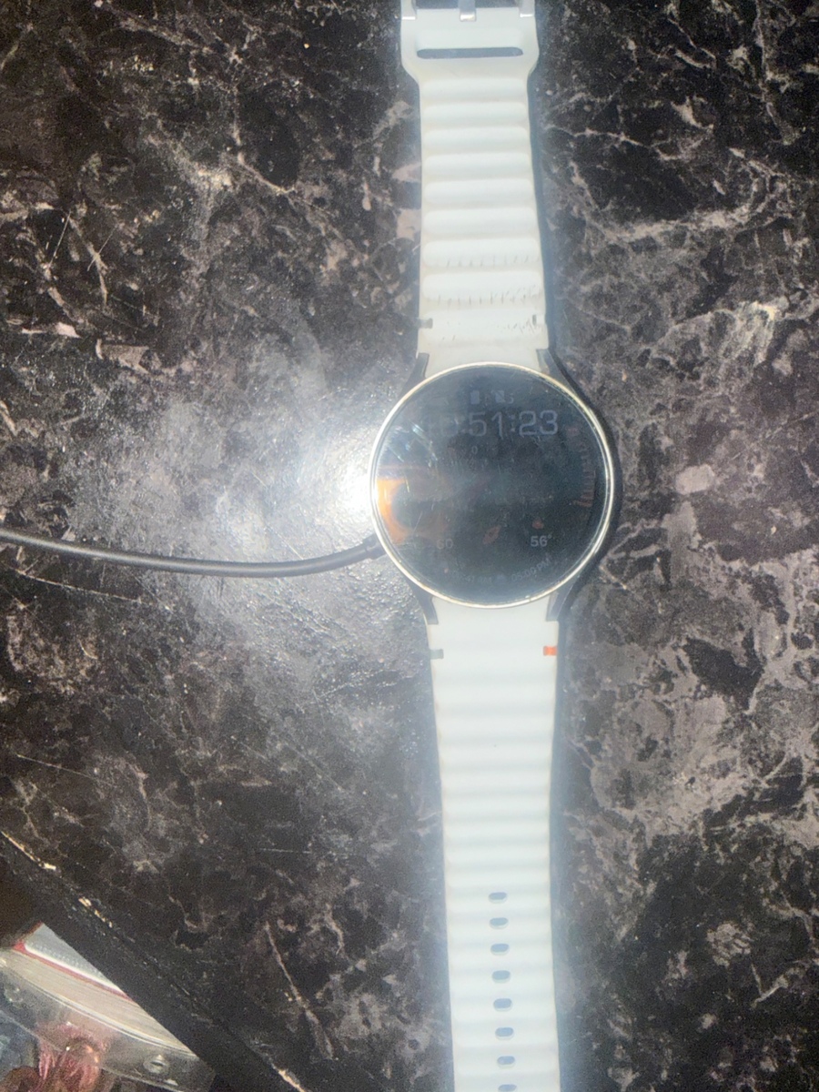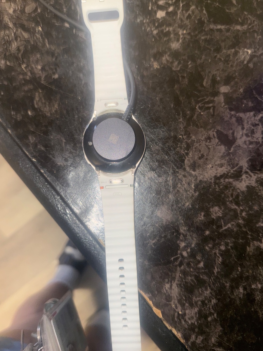 This white smartwatch offers a sleek and modern design perfect for everyday use. It features customizable watch faces and health tracking capabilities. The watch appears to be in good condition with a few signs of wear. Ideal for those looking to enhance their tech collection.