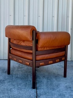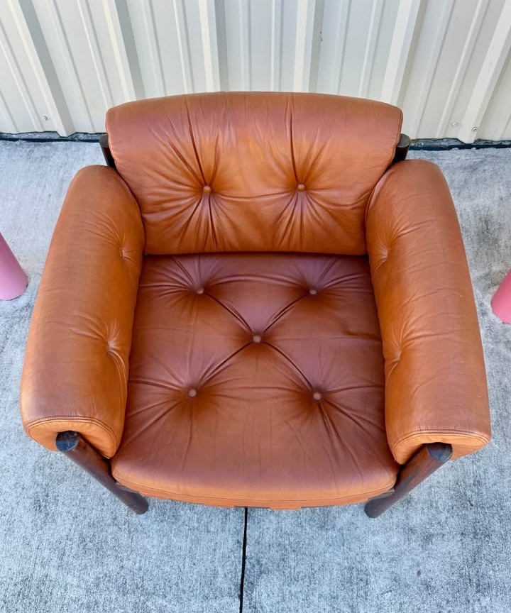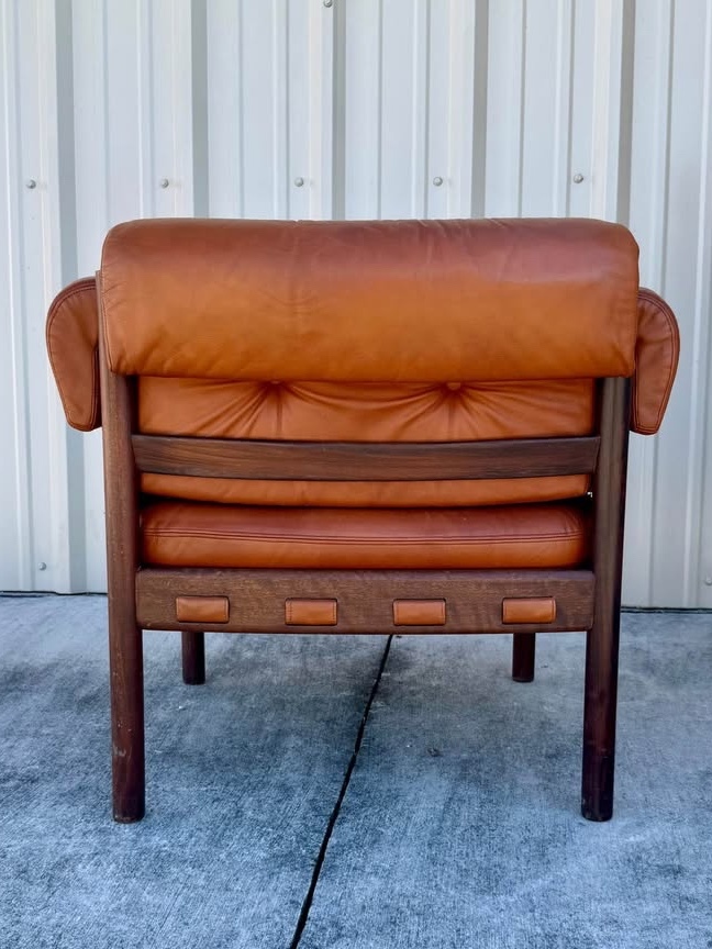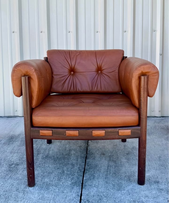 Beautiful vintage Arne Norell leather armchair in rich cognac leather with button tufting, rolled arms, and a solid wood frame with leather strap details. Extremely comfortable with a gorgeous aged patina that only true vintage Scandinavian leather develops. The frame is sturdy, the leather is soft, and it’s a perfect accent chair for living rooms, studios, offices, or a mid-century modern setup. This chair is part of a larger matching set (3-seater sofa + 2-seater loveseat available). Open to package pricing if you’re interested in more than one piece. • Height: 72 cm (28.3 in) • Width: 75 cm (29.5 in) • Depth: 71 cm (28 in) • Seat Height: 41 cm (16.1 in) Pickup in Lafayette, LA Can deliver to city outside of Lafayette for a fee.