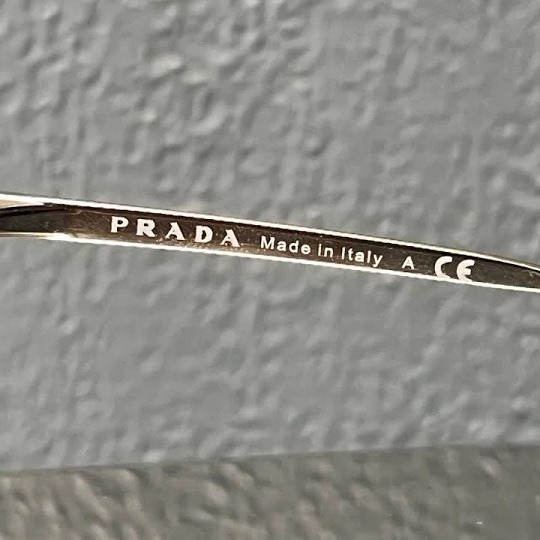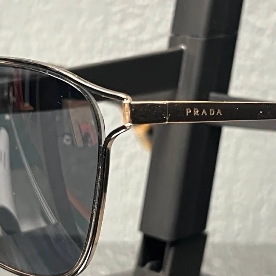 OBOModel: SPR54T Color: Black / Gold Includes Prada sunglass hard case - color: black The lenses shows a few hairline scratches. The frame has signs of wear. Hairline scratches, and slight tarnishing, but overall are in good condition. See photos Polished gold finish, black lens, and PRADA print detail. Sunglass case included.