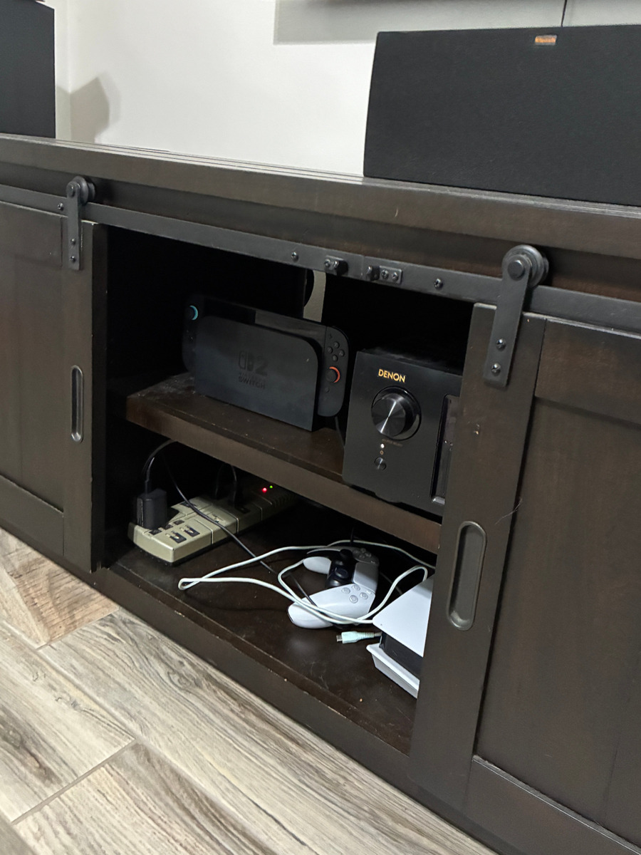 OBOThis TV console is constructed of poplar solids and veneers with a hand-applied espresso finish. There are 3 drawers on each side with full extension ball-bearing metal drawer guides. Barn door hardware center doors slide open and shut to reveal an adjustable interior shelf. Rear panels for easy access to audio/video components Full-extension, ball-bearing metal drawer guides Hand-distressed rustic finish Adjustable shelf Ventilated shelves Dimensions: 75" L x 24.1" H x 21" D Load capacities: 135 lb (top), 50 lb (shelf), 10 lb (drawer). Overall Dimensions: Width: 75 inches, Height: 24.1 inches, Depth: 21 inches Purchased from Costco in 2019 Listing is for console only.