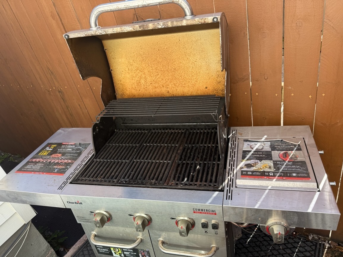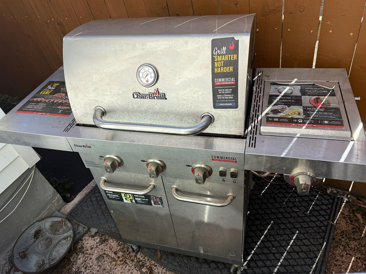 Char-Broil commercial gas grill with multiple burners and a side burner. Good working condition, not used much over the years. Gas tank not included. Retails for $400.