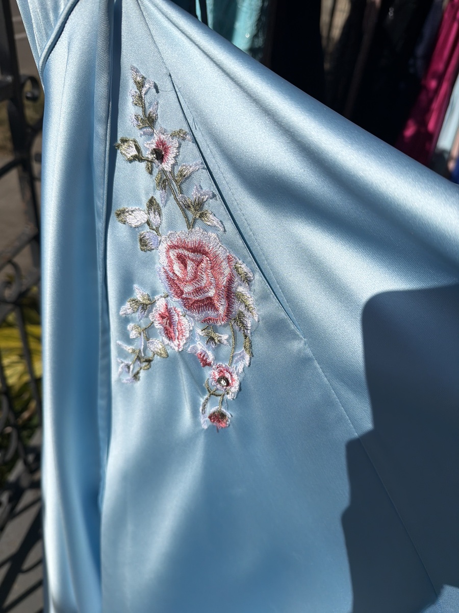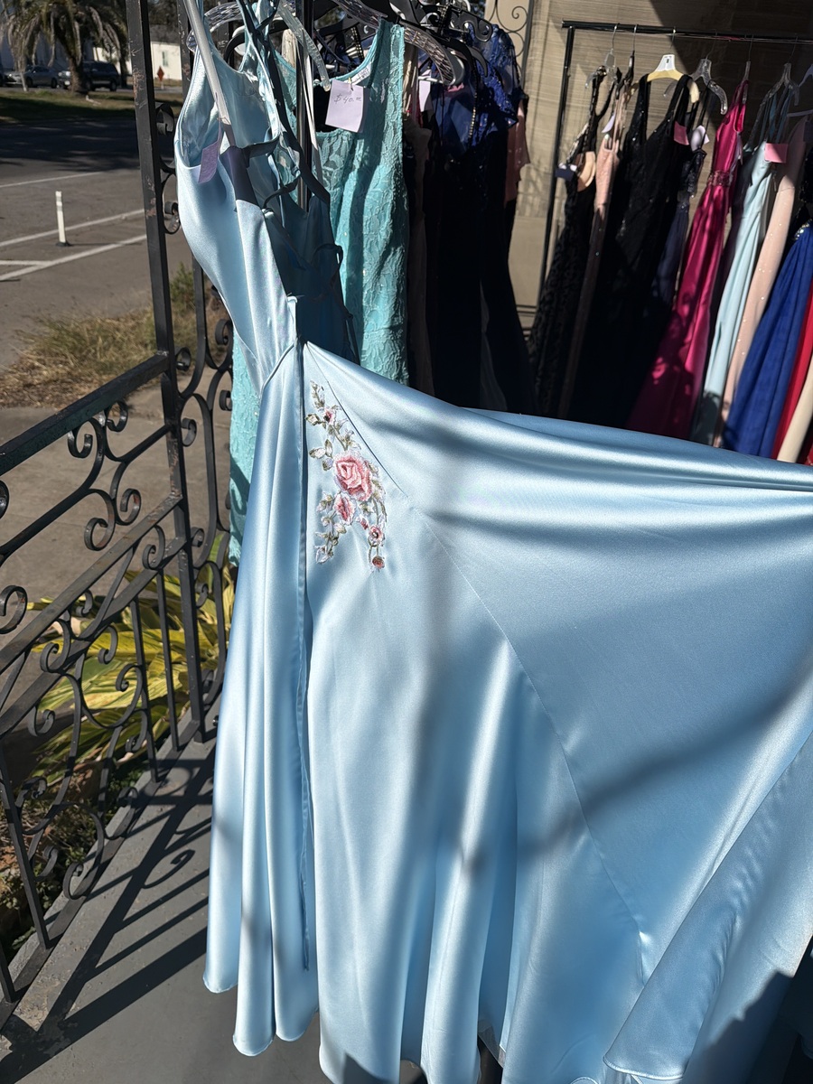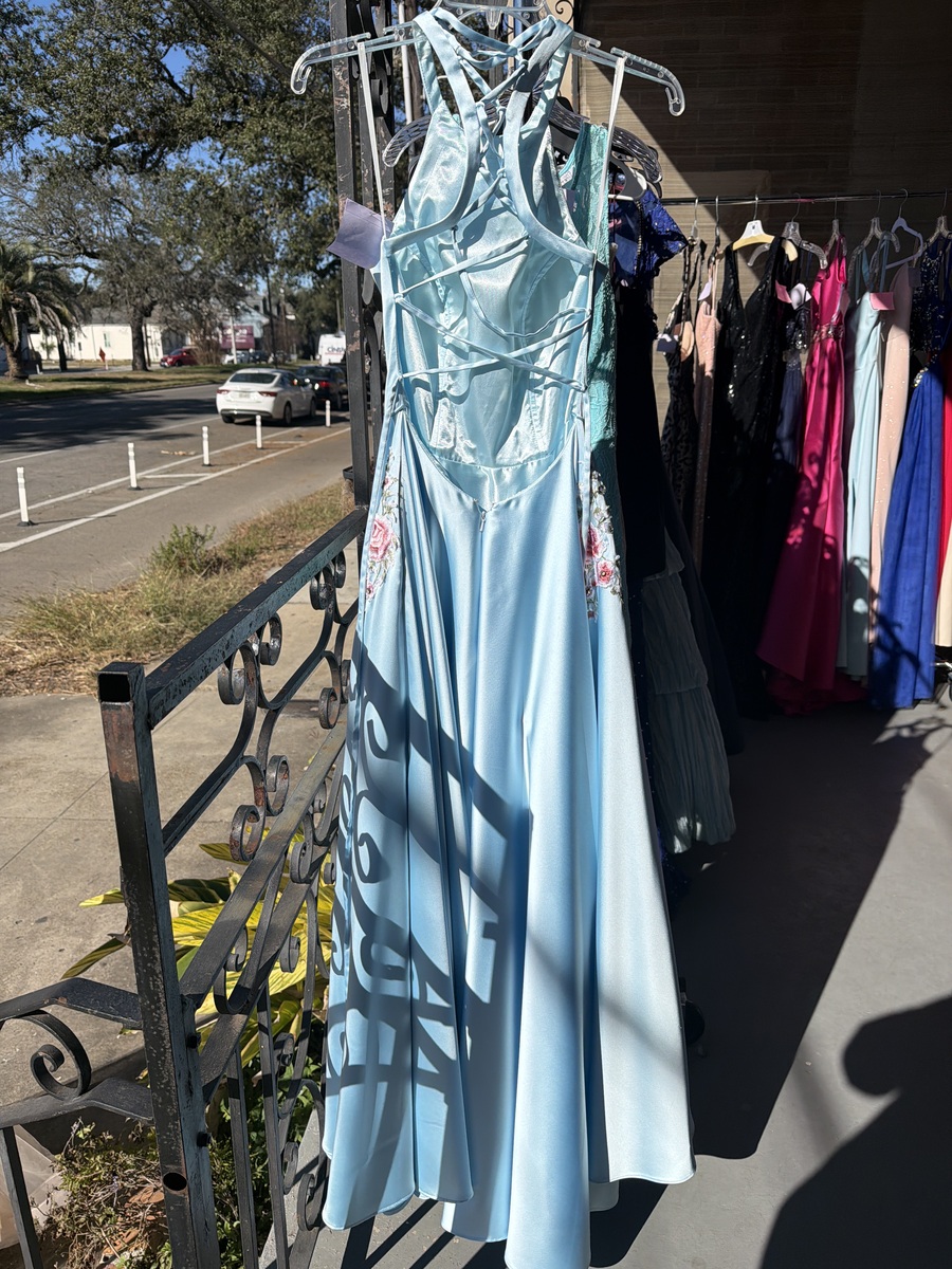 This stunning blue evening gown features a high neckline and a flowing skirt, perfect for formal events or proms. The dress is in excellent condition with no visible flaws, offering both comfort and style. Its elegant design and quality fabric make it a standout piece in any wardrobe.
