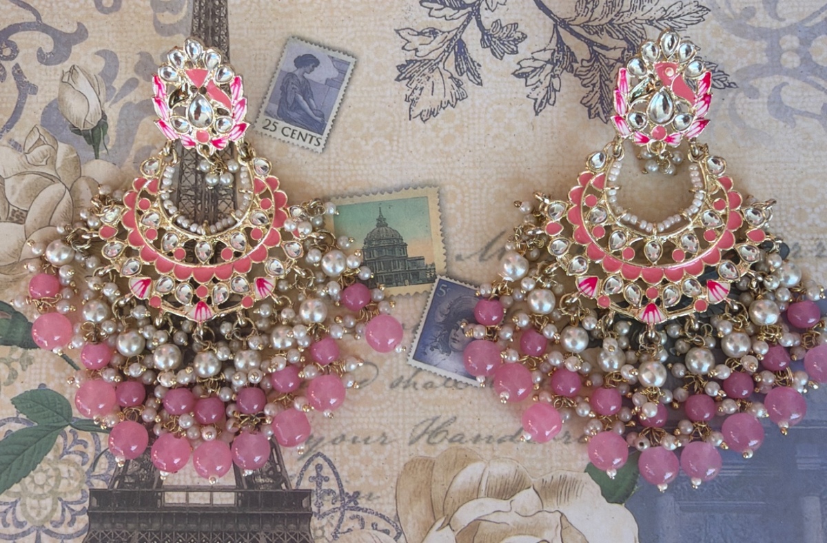 Stunning pink and gold chandbali earrings featuring intricate design and faux pearl accents. These statement pieces are perfect for special occasions and add a touch of elegance to any outfit. In excellent condition with vibrant colors and secure clasps.