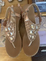 These stylish embellished sandals feature sparkling gems and a comfortable design, perfect for both casual and dressy occasions. They are in excellent condition, showing minimal signs of wear. Ideal for adding a touch of glamour to your outfit.