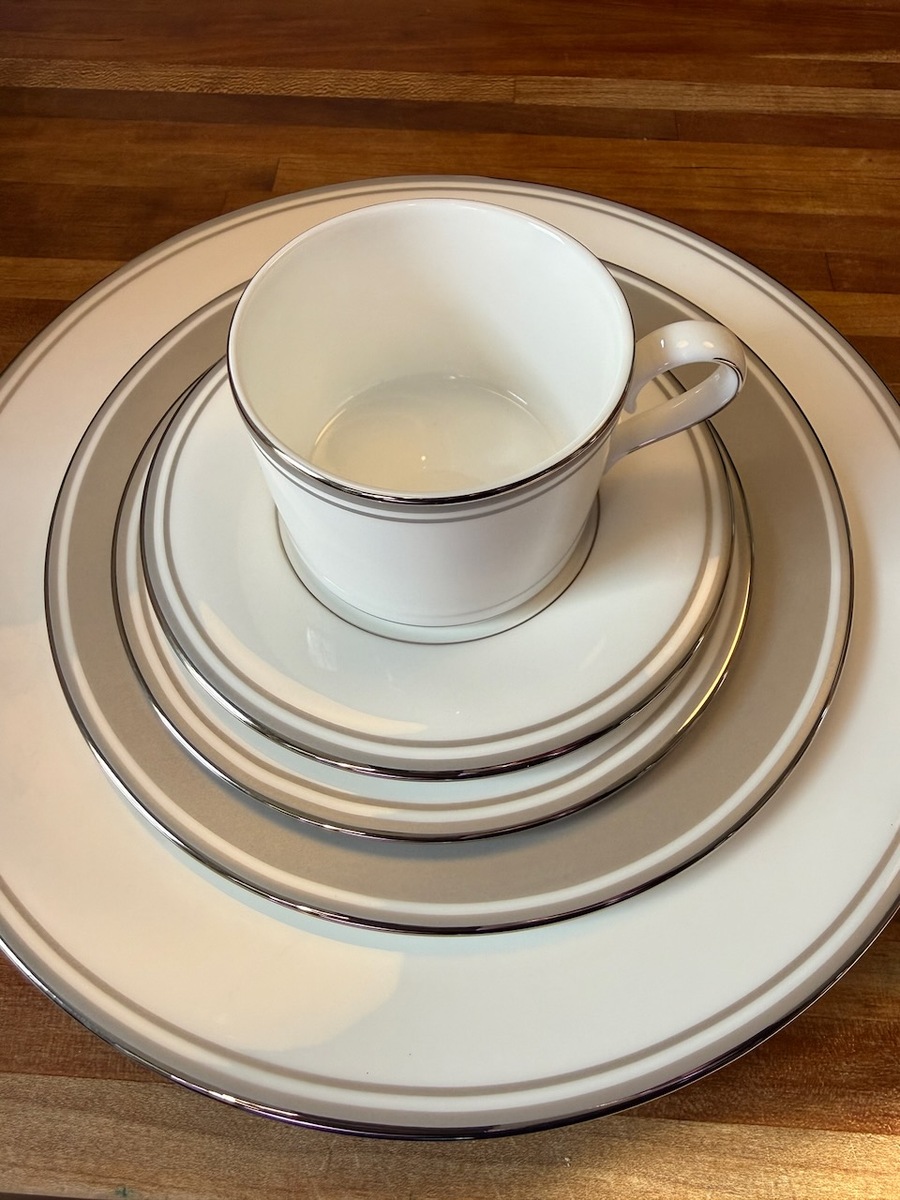 5 of the following 5-piece sets, new in box: Crafted of Lenox white bone china accented with precious platinum Dishwasher-safe Diameter of dinner plate: 10-3/4-inch, salad plate: 8-inch, butter plate: 6-inch, saucer: 5-3/4-inch; capacity of cup: 6 ounce Includes dinner plate, salad plate, butter plate, cup, and saucer
