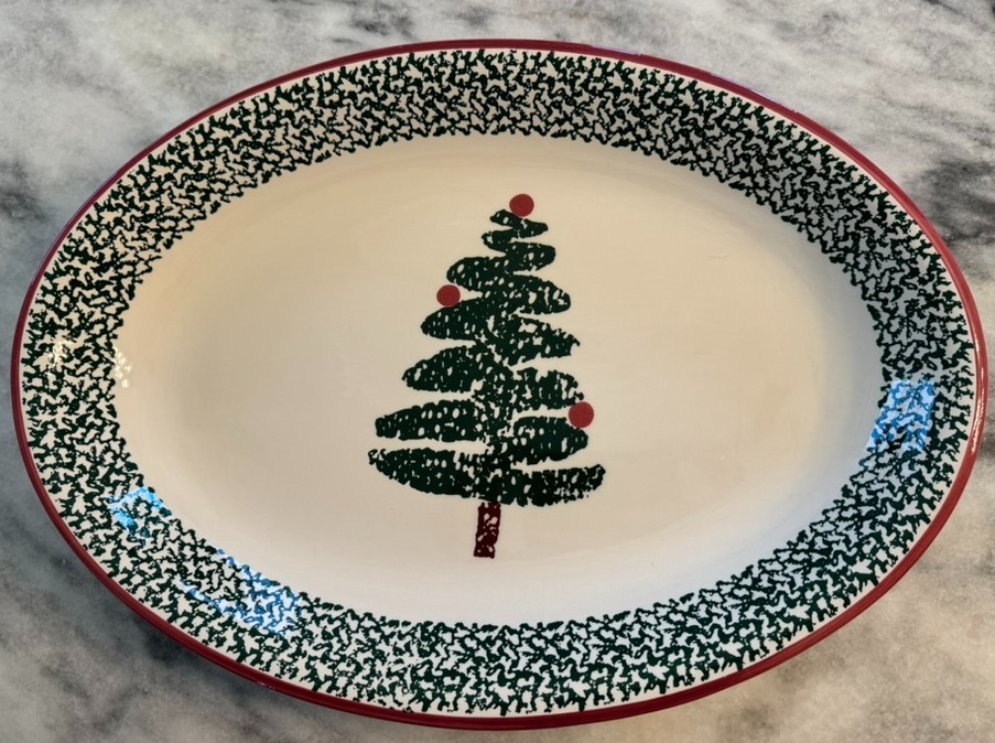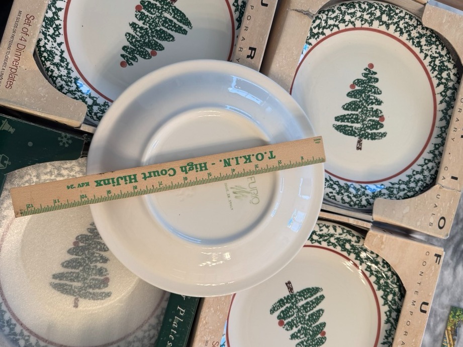 This charming holiday dinnerware set by FURIO features a festive holiday tree design, ideal for seasonal gatherings. The set includes 12 dinner plates (in original boxes), 1 serving platter, 1 serving bowl, 4 matching napkins, and 1 serving tray. See photos for measurements. All pieces are in excellent condition. Perfect for adding a touch of holiday cheer to your dining table! Please pick up in the Marigny. Prefer to sell as a set.