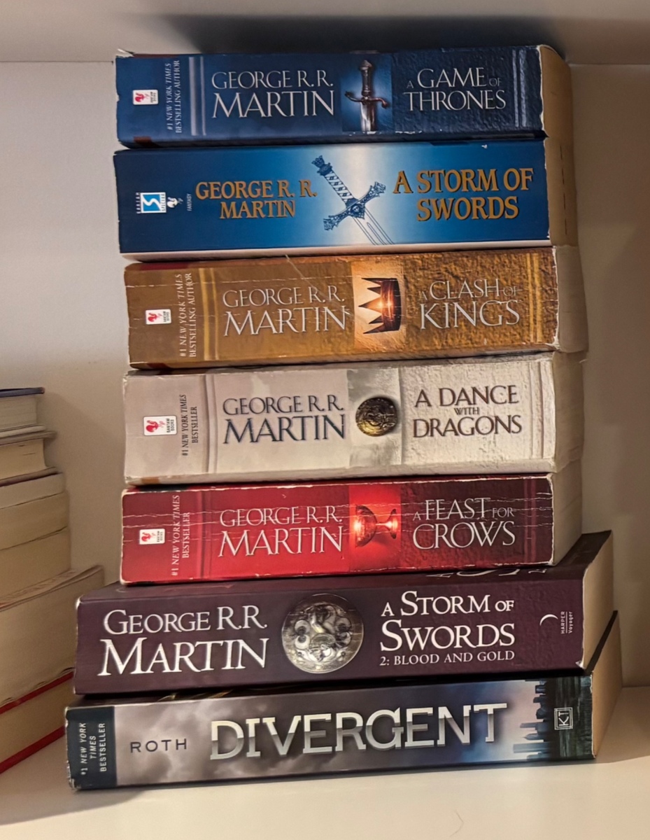 OBOGeorge R.R. Martin Book Bundle A Game of Thrones A Clash of Kings A Storm of Swords (Volumes 1 and 2: Blood and Gold) A Feast for Crows A Dance with Dragons Also includes: Divergent by Veronica Roth All books in this stack for $25