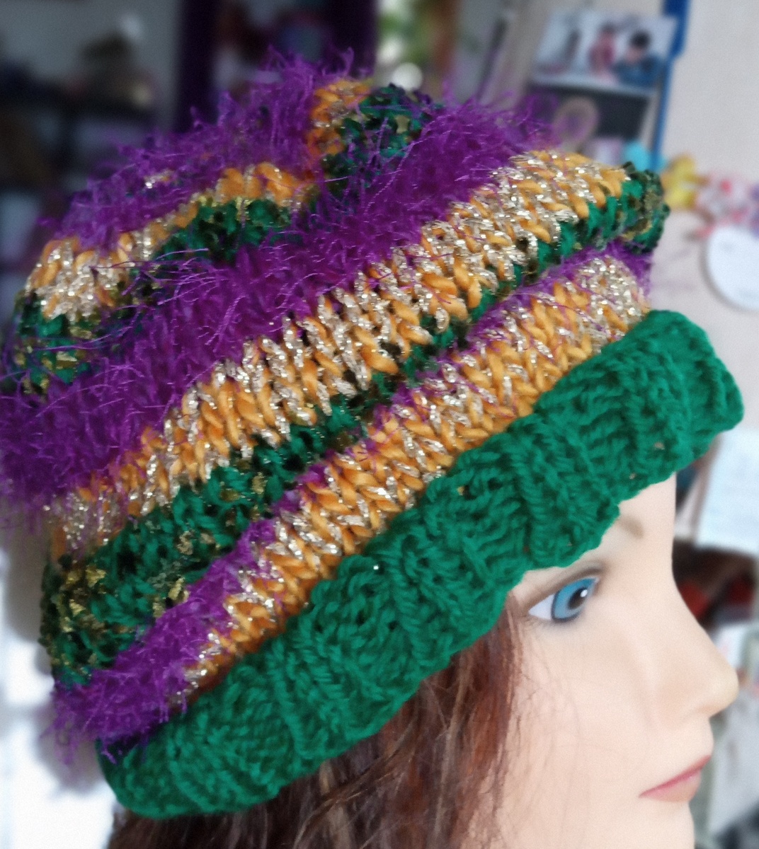 handknit hat mardi gras colors
