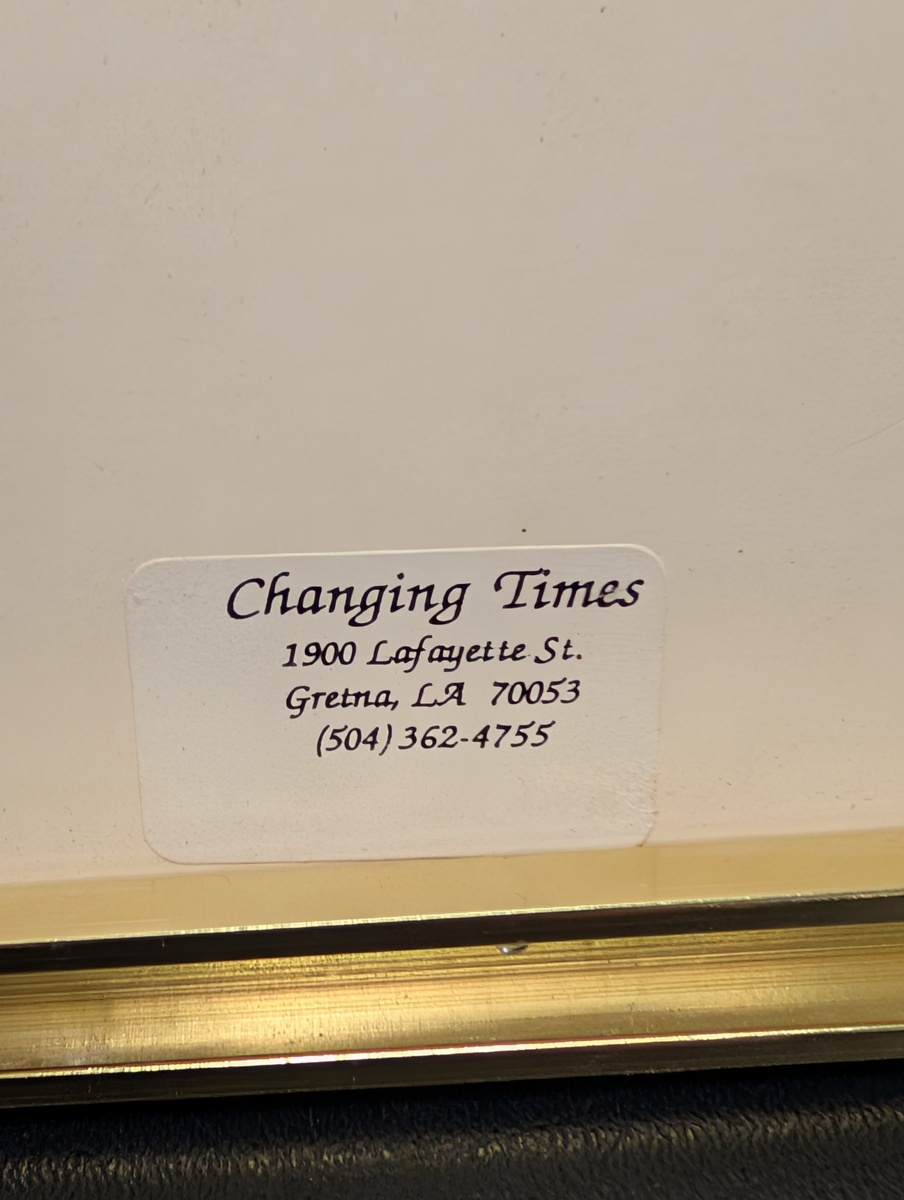 This is a framed print of historic Algiers Point as painted by Zhang Xiang, framed by a local Gretna framer. Print has some wear on it from age but is in overall good condition.