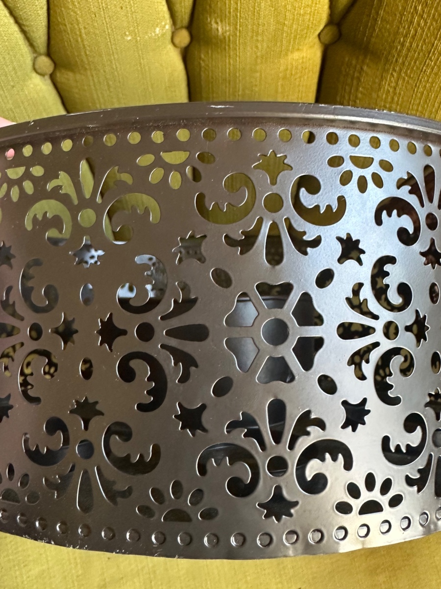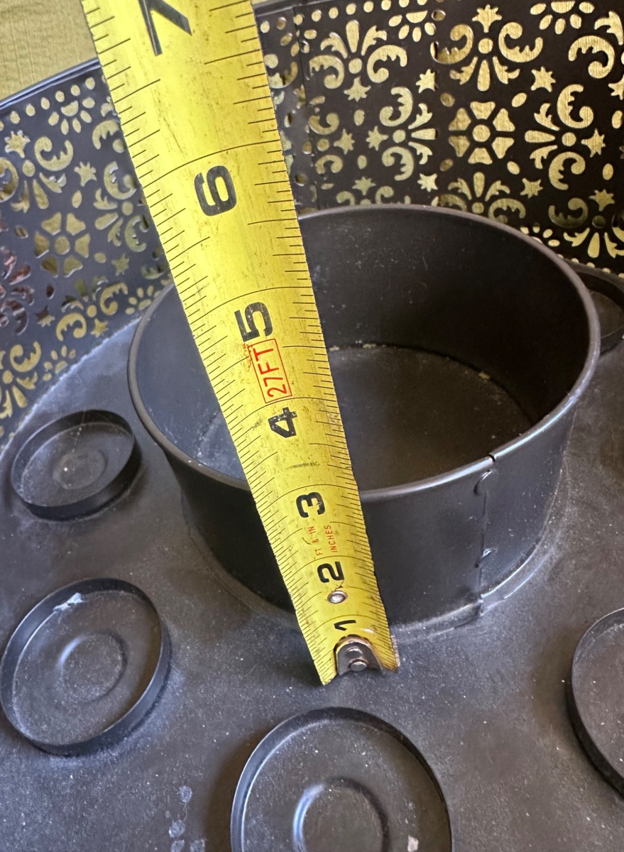 OBOI used this black metal centerpiece for years, but its size doesn't suit my current setup. It's gorgeous with a vase in the middle and tealight (or other) candles in each slot and the shadows from the cutouts dance beautifully. Measurements pictured, no stickers or makers marks that I could find. It's pretty lightweight and seems like it would take paint well. I'll clean it out pre-drop off, I just realized the pics are a little dusty.