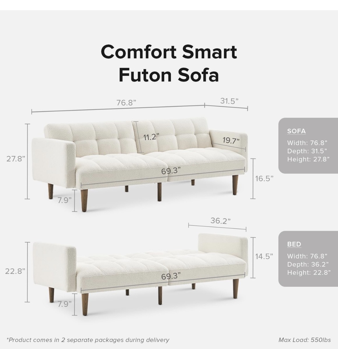 $150.00 33% off OBOThis modern white adjustable futon offers a sleek and comfortable design that's perfect for any living room. It features a soft, textured fabric and sturdy wooden legs, providing both style and durability. Spill resistant, boucle material
