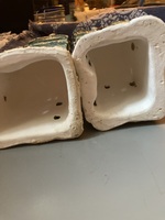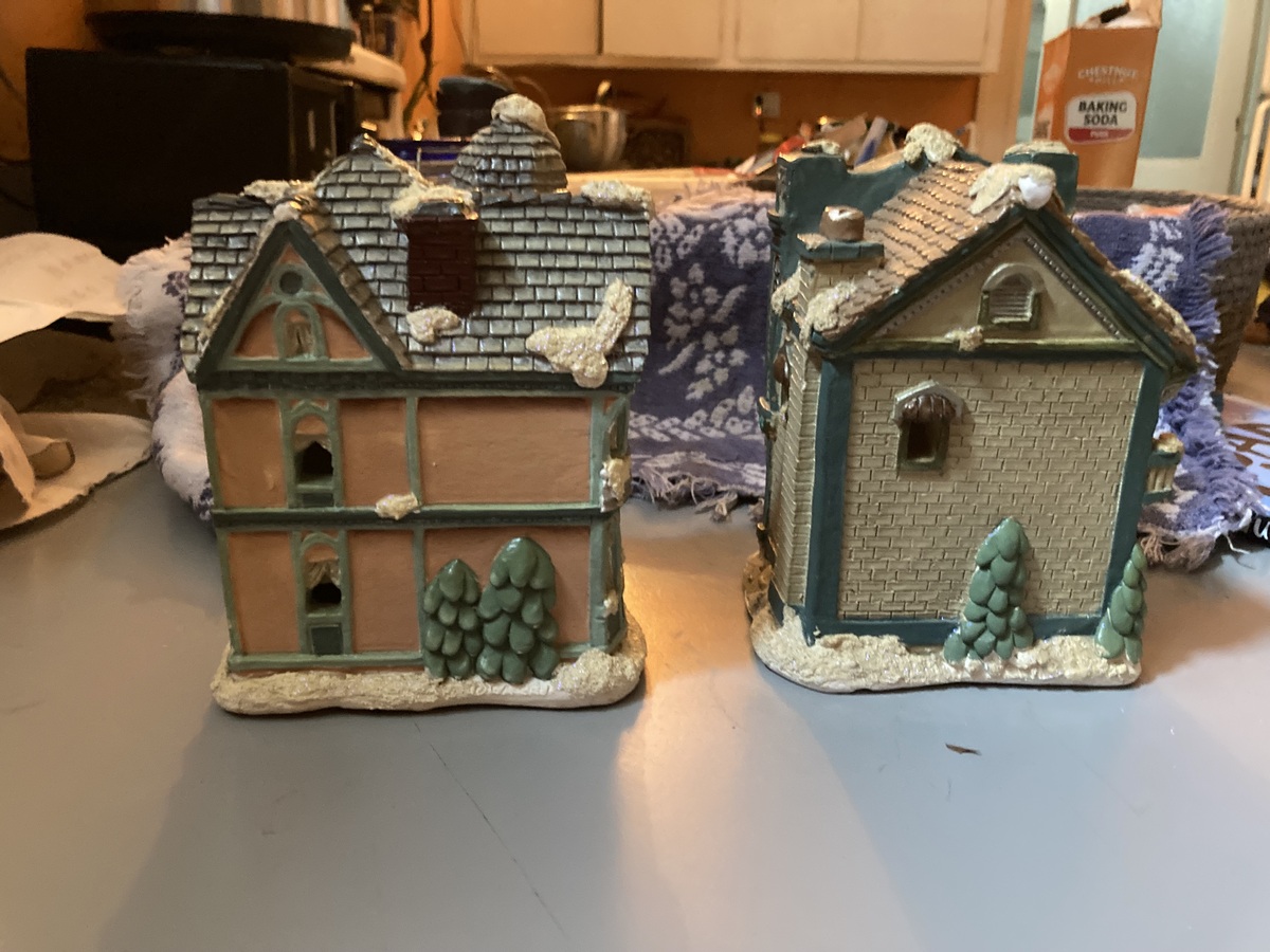 Last Minute Xmas Decor Idea- two beautiful hollow ceramic houses with open window ports for illumination from tea candles. . Interiors of each are clean without smudge marks