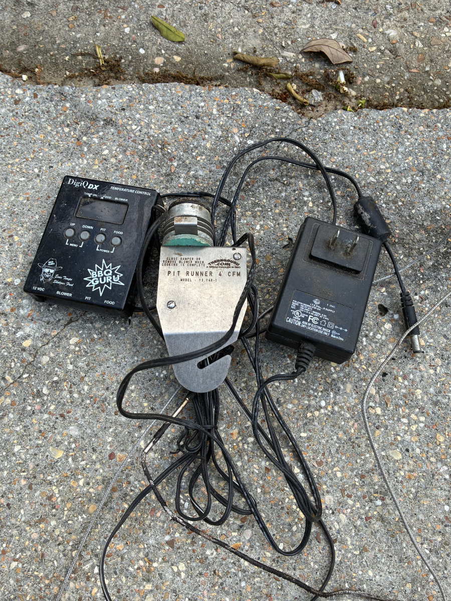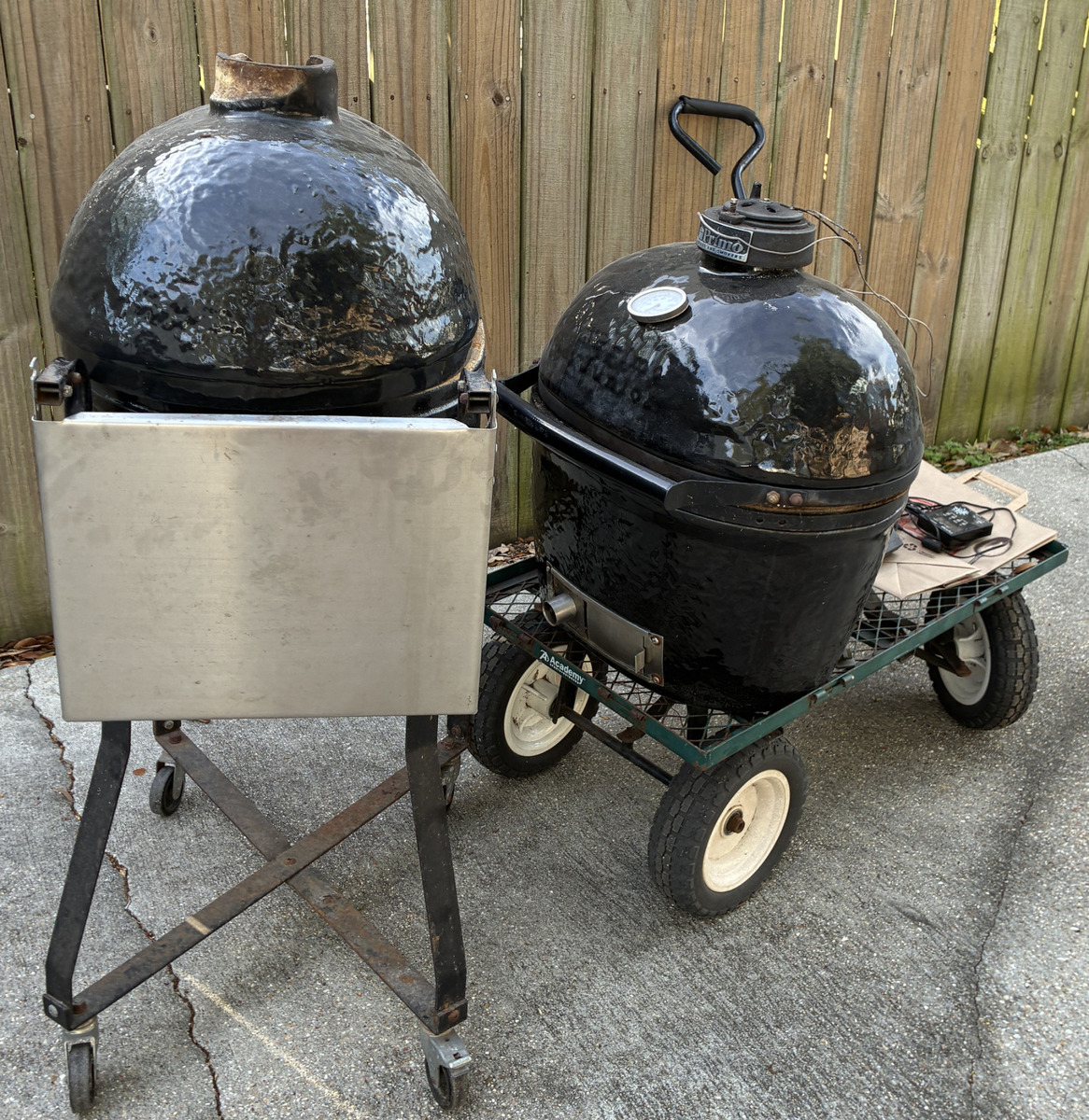 OBOFor Parts/Repair, x2 ceramic grills with accessories pictured, and 1 rolling cart with fold away trays