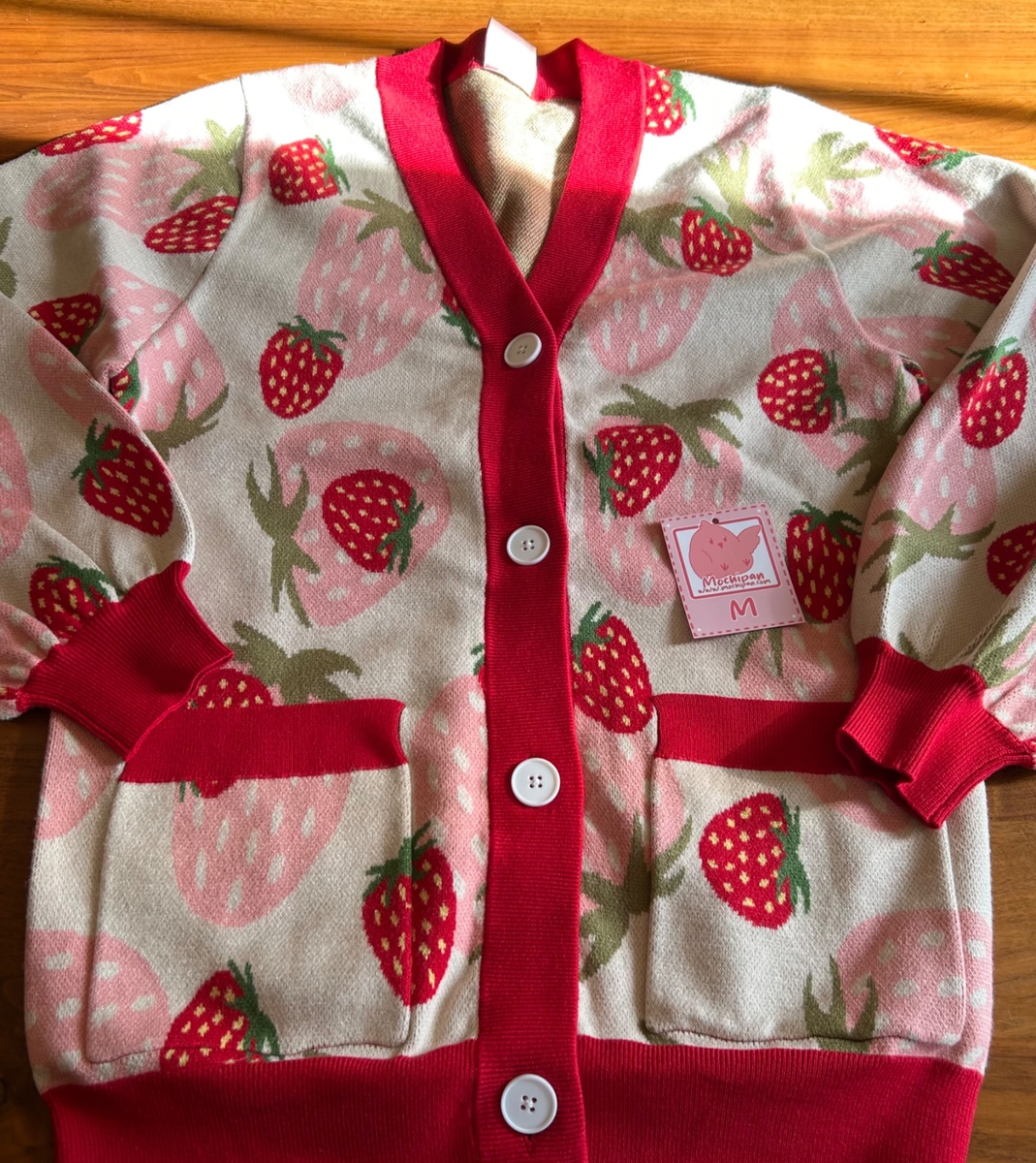 Purchased as a Christmas present for a teen who saw it on TikTok, but then she didn’t love the oversized fit. Heavy weight and so soft, size M, bell sleeves, tags included but not attached. Delightful for the right person. Retails for $95 + shipping. Link below: https://mochipan.com/products/strawberry-cardigan